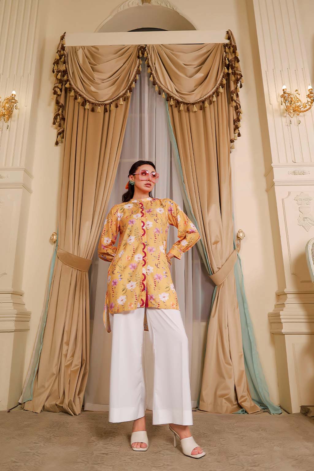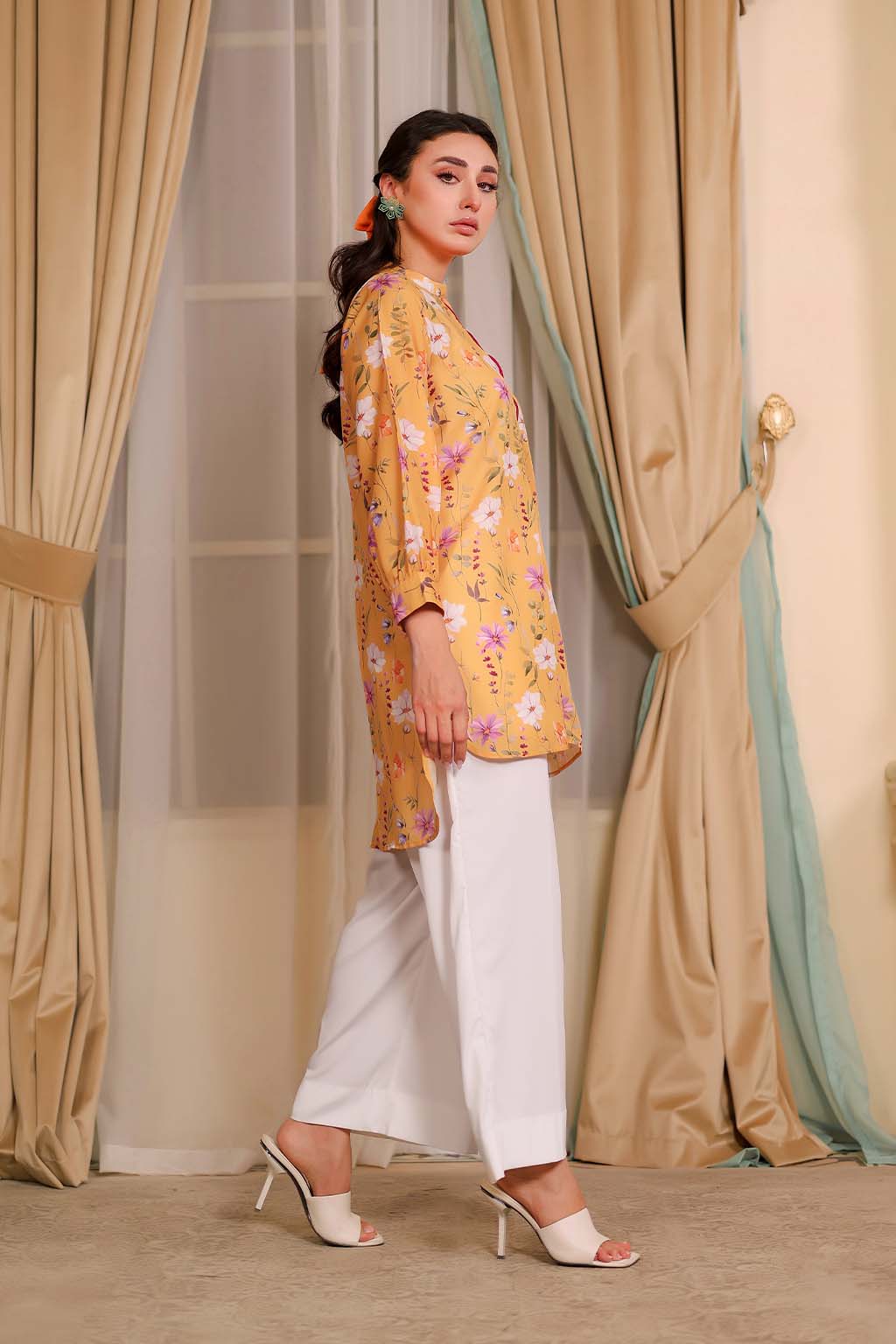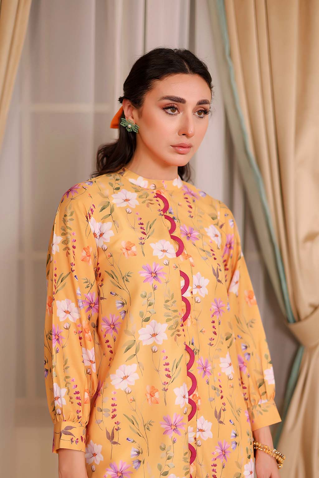 Bright and breezy, the Citrus 2-Piece Coord Set from Adwears’ LUMINE Collection brings a splash of sunshine to your everyday style. Crafted from breathable Premium Lawn in a vibrant yellow hue, this set radiates effortless charm. The button-down top is adorned with a delicate floral print, full-length sleeves with stylish cuff details, and a neat hook-and-eye closure. A modern high-low hemline adds a contemporary edge while ensuring comfort.