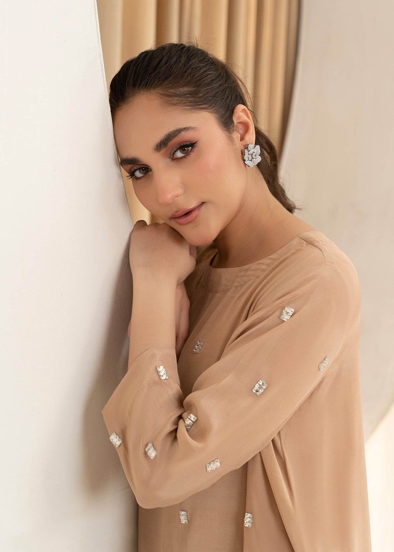 Step into elegance with this delightful nude co-ord set, featuring boat neck and diamantees all over front and sleeves. Paired with wide leg pants.
