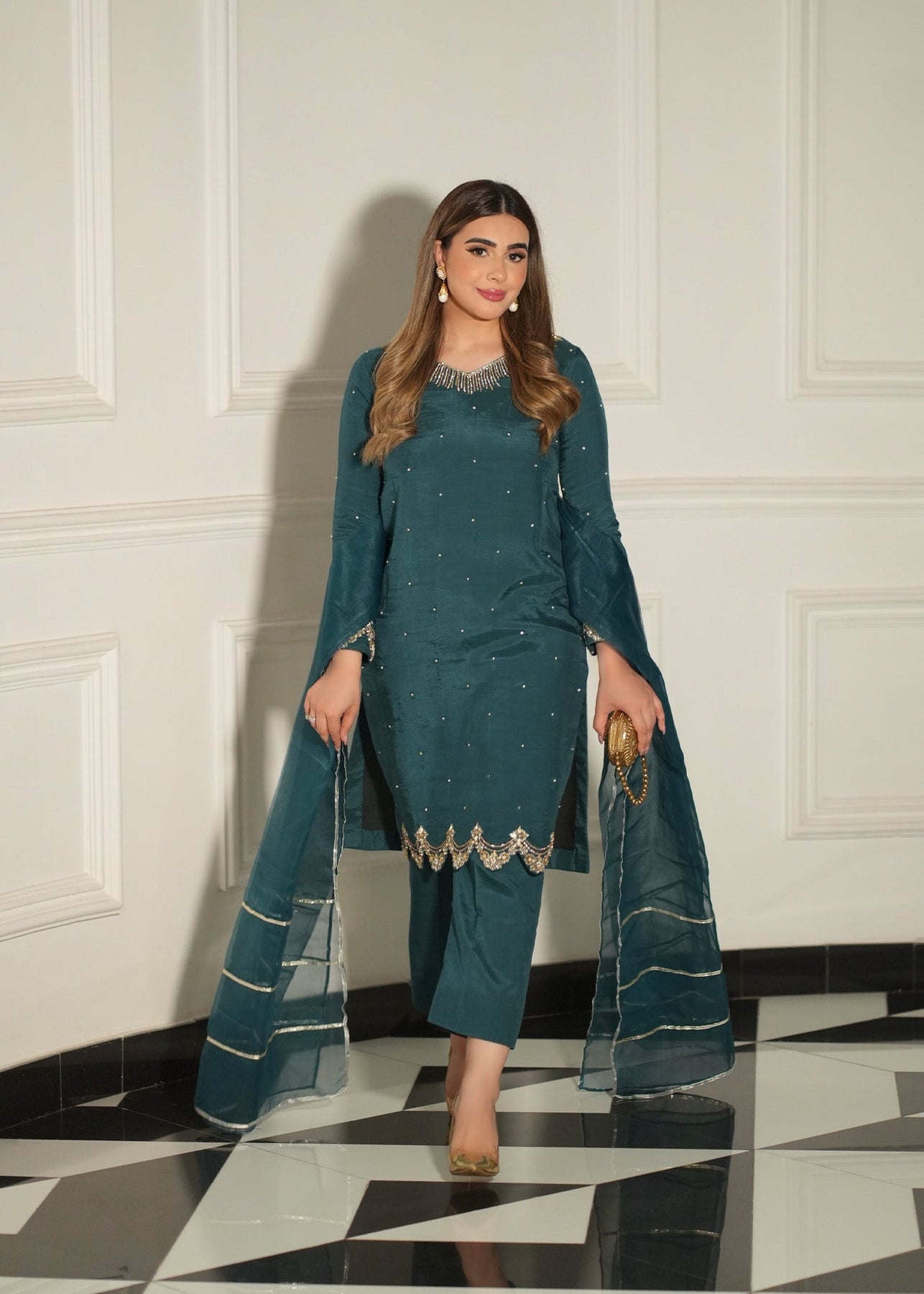 A regal deep sea green ensemble including a beautiful raw silk shirt with embellishment detailing on neckline, hem and sleeves  -  a masterpiece that combines elegance and intricate craftsmanship. It is paired with wide pants and comes with organza dupatta with gota finishing on all four sides.  this outfit guarantees all eyes will be on you.