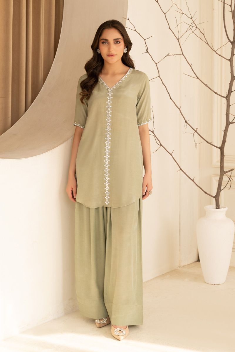 Nora offers a breezy, lightweight silhouette with chunky stone work on the front and sleeves, and comes with a matching shalwar, making it a balanced ensemble for both casual and semi-formal events.