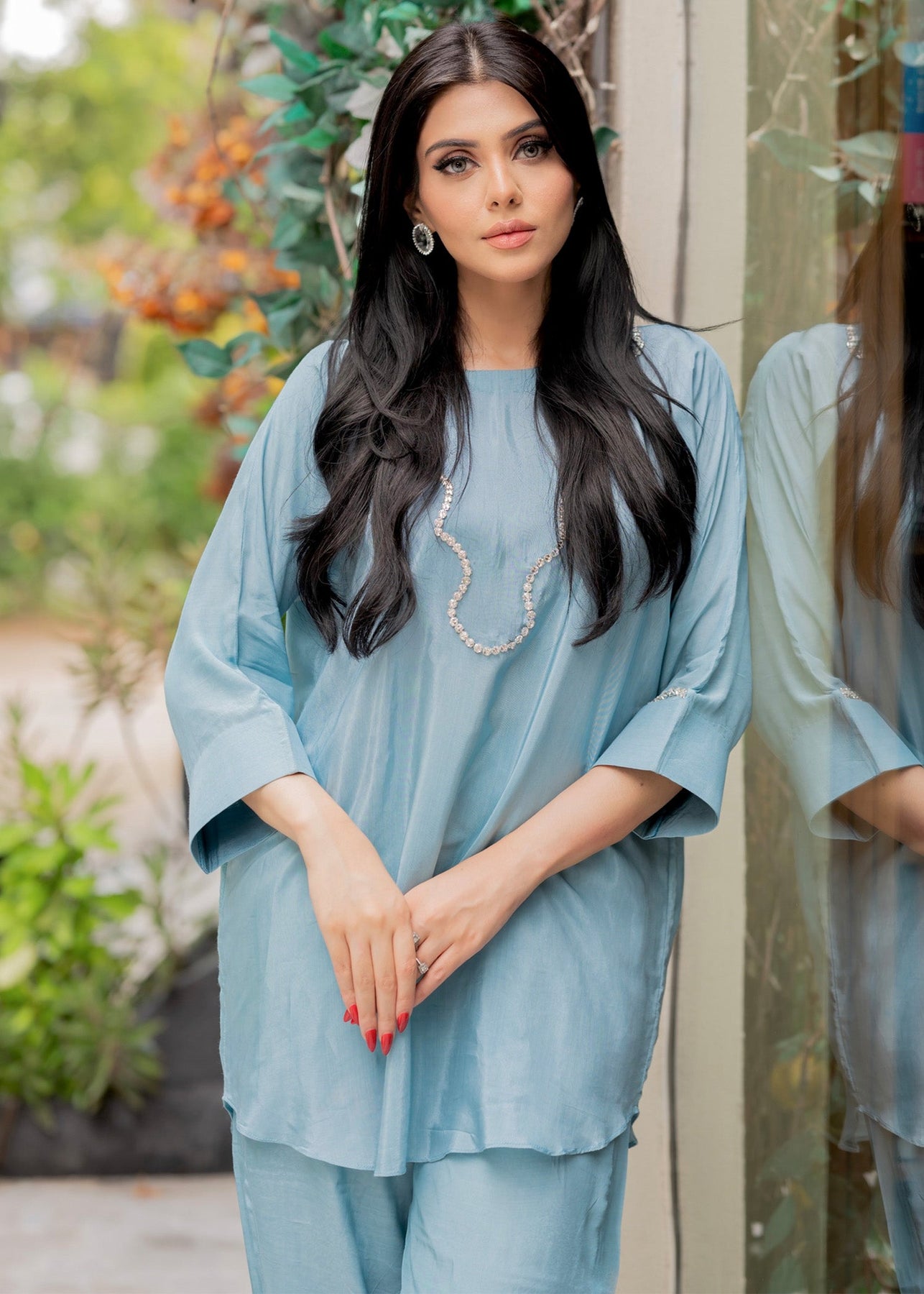 Step into elegance with this delightful sky blue co-ord set. A flowing, graceful silhouette, featuring minimal bling on the neckline, adds an extra layer of style and modernism!