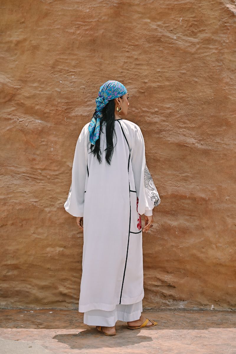 Palmae is bold, breezy, and made for days when you want your outfit to do the talking. The relaxed, baggy silhouette is paired with straight pants for easy movement, while the pirate style sleeves bring a playful twist. A striking reddish blue palm tree motif sits proudly at the neckline, instantly catching the eye, with matching black palm trees along the sleeves for a cool, laid back balance. It’s the perfect blend of comfort and sunset strolls, salty air, and effortless Mediterranean style