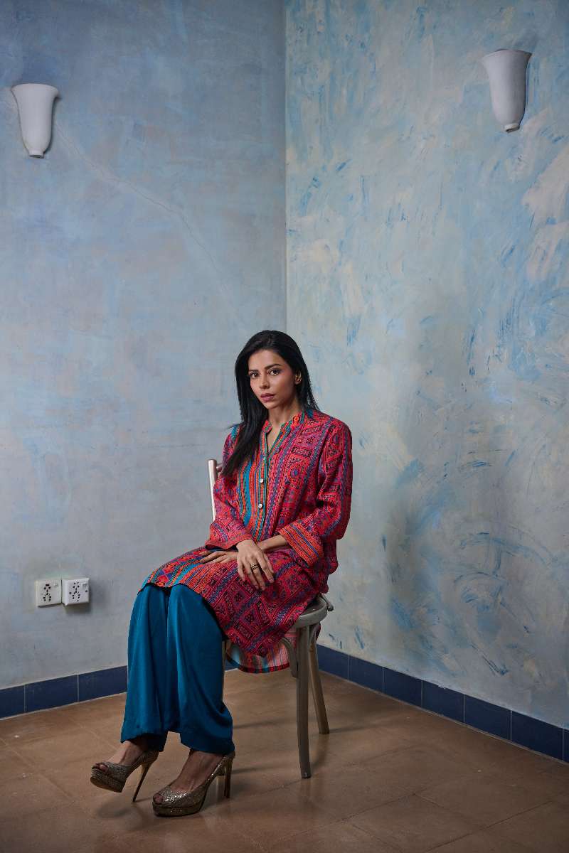 Our newest set from our in-house Gulabo Print, inspired by Truck Art. With a classic V neck and collar extended into a front button placket adorned with fancy buttons, this sleek printed kurta is paired with loose fit solid coloured trousers.