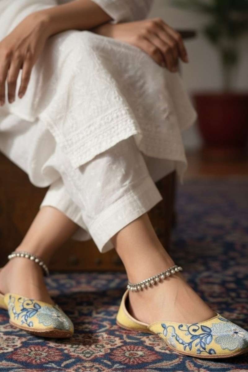 The "Blue Bird Khussa" is a charming and comfortable piece of footwear that blends traditional artistry with superior wearability. It is crafted from elegant raw silk and features a sophisticated embroidered upper decorated with floral embroidery using blue thread, which beautifully enhances the overall look of the base color. This motif is set against a simple, plain back. Designed for all-day comfort, this khussa is exceptionally soft and comfortable, built with a double-padded sole and back for maximum support, and finished with a durable sole for reliable use.