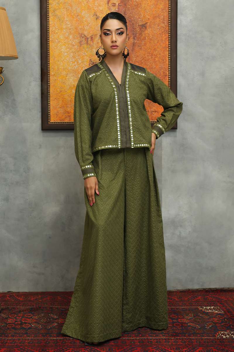 Open-front chiffle co-ords set featuring a V-Neckline and lace detailing on the sleeves and jacket, paired with wide-leg pants for a chic, modern look Jacket Colour:Olive green Fabric: Chiffle Wide-leg Pants Colour: Olive green Fabric:Chiffle