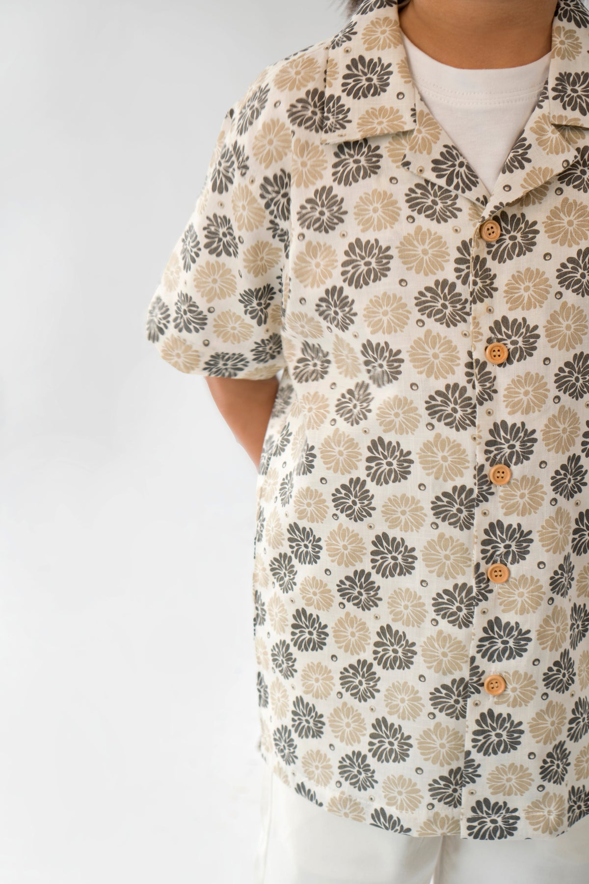 A breezy ode to summer days, the Sand & Sage printed shirt is designed for boys who like to stay cool and look sharp. Featuring a soft floral block-style print in muted sage green and warm sand on an ivory base, this Cuban-collared shirt is crafted from airy French linen for breathability and style. The relaxed half-sleeve cut and wooden button-down front make it a go-to for everything from casual family brunches to beachside strolls.