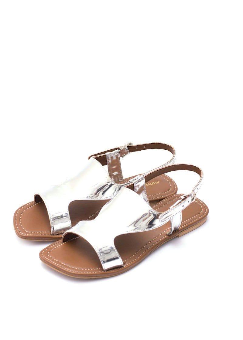Silver sandal, popularly known as, kohati.  Fastens with a metal buckle closure. -Upper- White Leatherette -Flat Heel -Anti-slip Sole -Foam Padding for insole for comfort Handcrafted in Pakistan Care: Super easy to clean! Wipe with a sliglty damp cloth to clean off any dust.