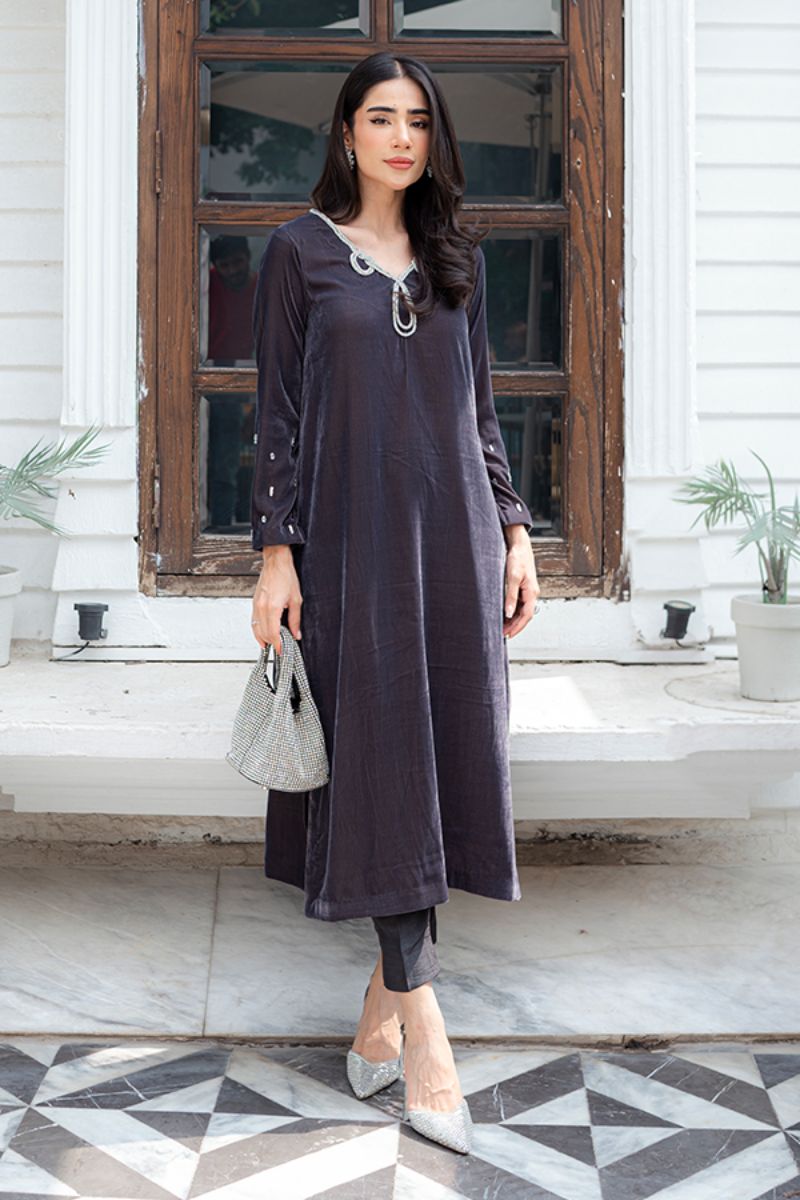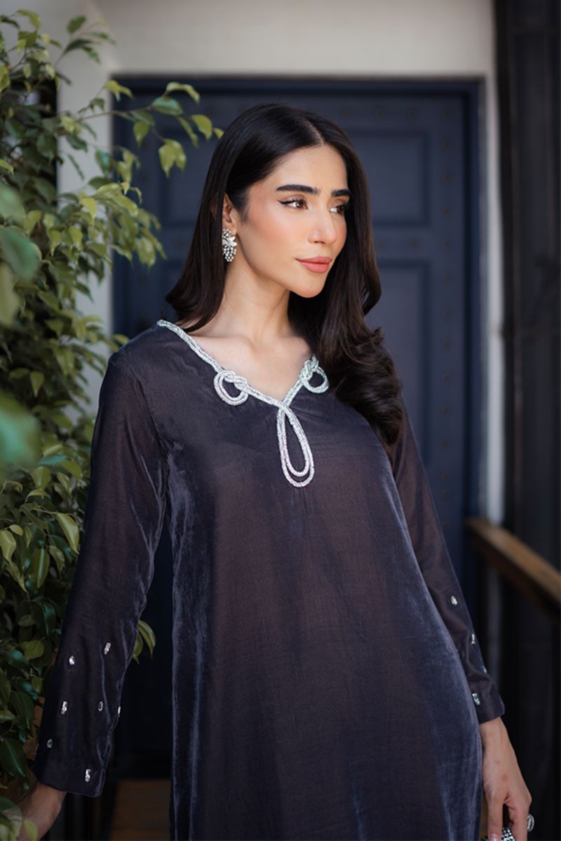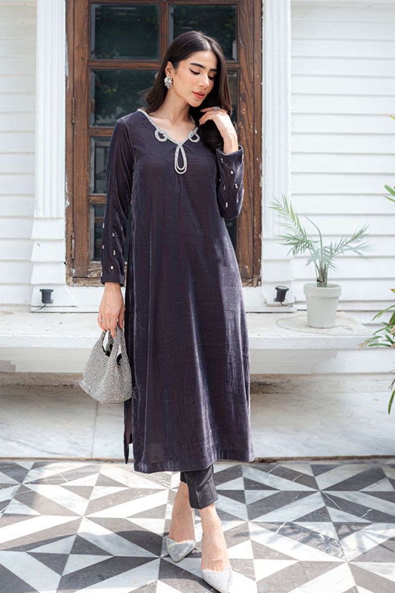 Regal Ash exudes quiet elegance with its grey velvet A-line shirt and delicate embellishments. Paired with Korean silk cigarette pants, it offers a timeless, refined look. Regal Ash is for those who appreciate simplicity with grace and sophistication.