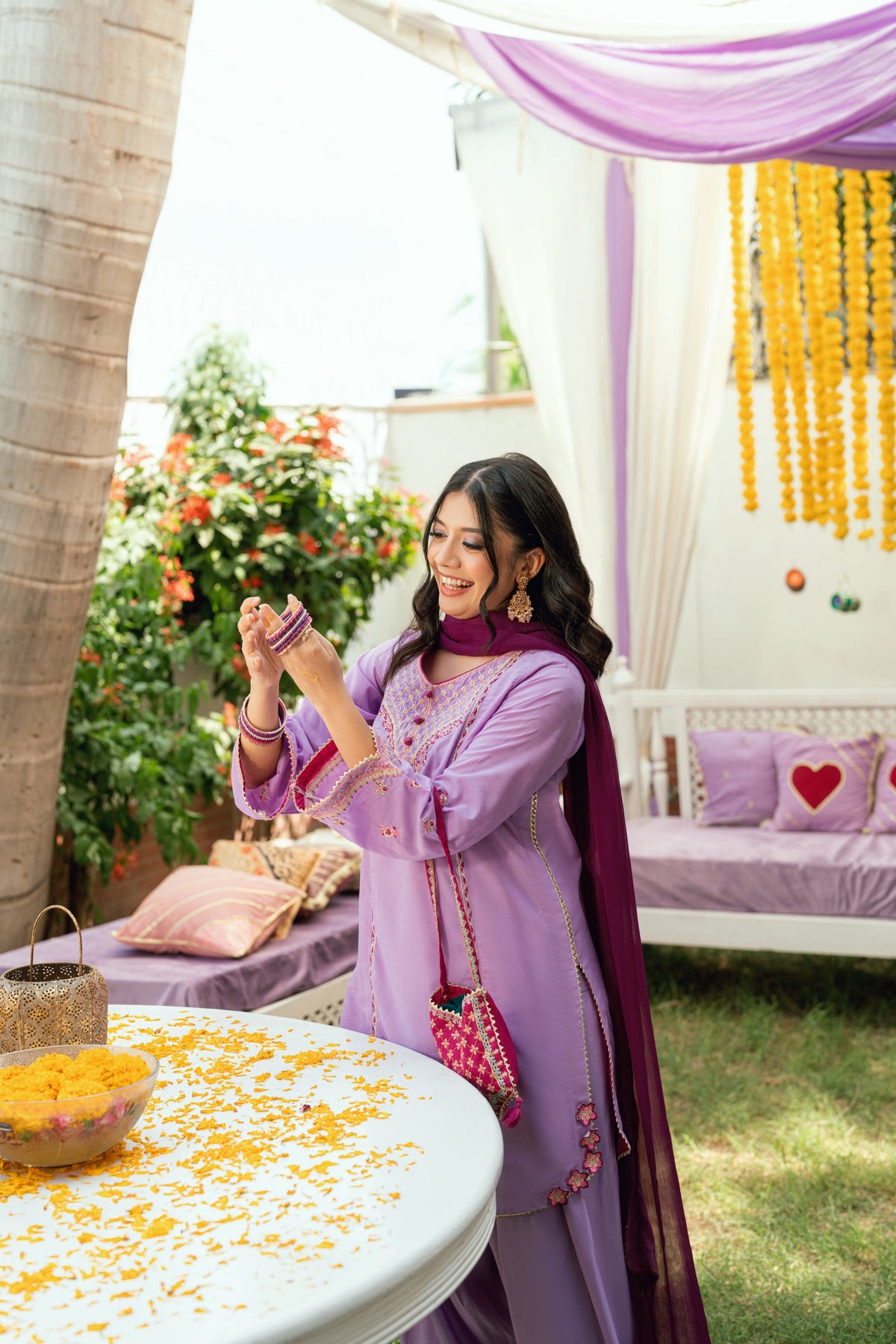 Dupatta Details: Chiffon contrasting purple chiffon dupatta with gota and fabric manipulation