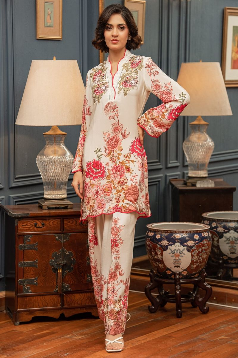 A refined two-piece set that exudes timeless elegance. This Shamaeel Ansari ensemble features a short, straight shirt, delicate intricate on side of neckline, and adorned with embroidered border on neckline paired with a farshi shalwar. In serene white and pink tones, this set seamlessly blends sophistication with a refreshing burst of color, making it an exquisite addition to your wardrobe this summer season, all day wear, Perfect for Eid look and casual outings. FABRIC - Shirt & Shalwar: Khadi sillk