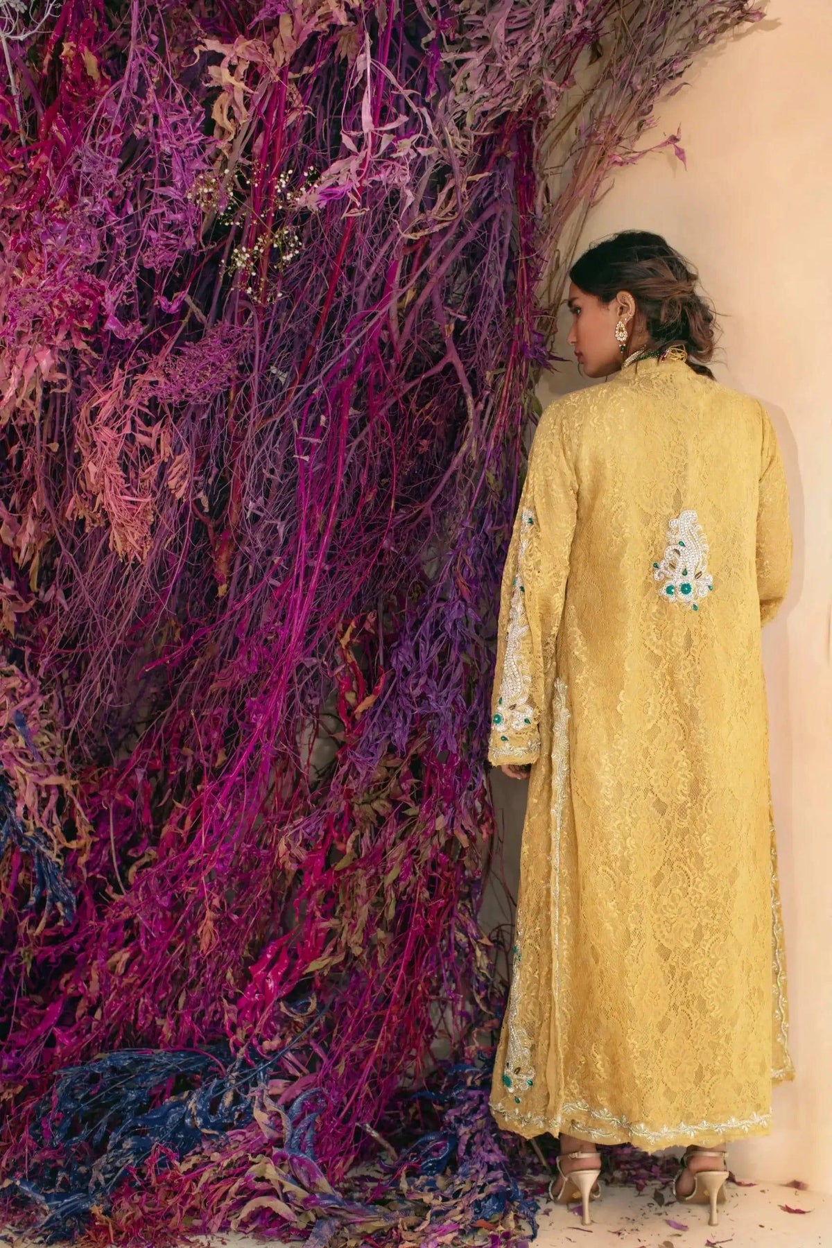 Gold chantilly lace coat with silver & gold handworked embellishment paired with matching slip & azaar pants