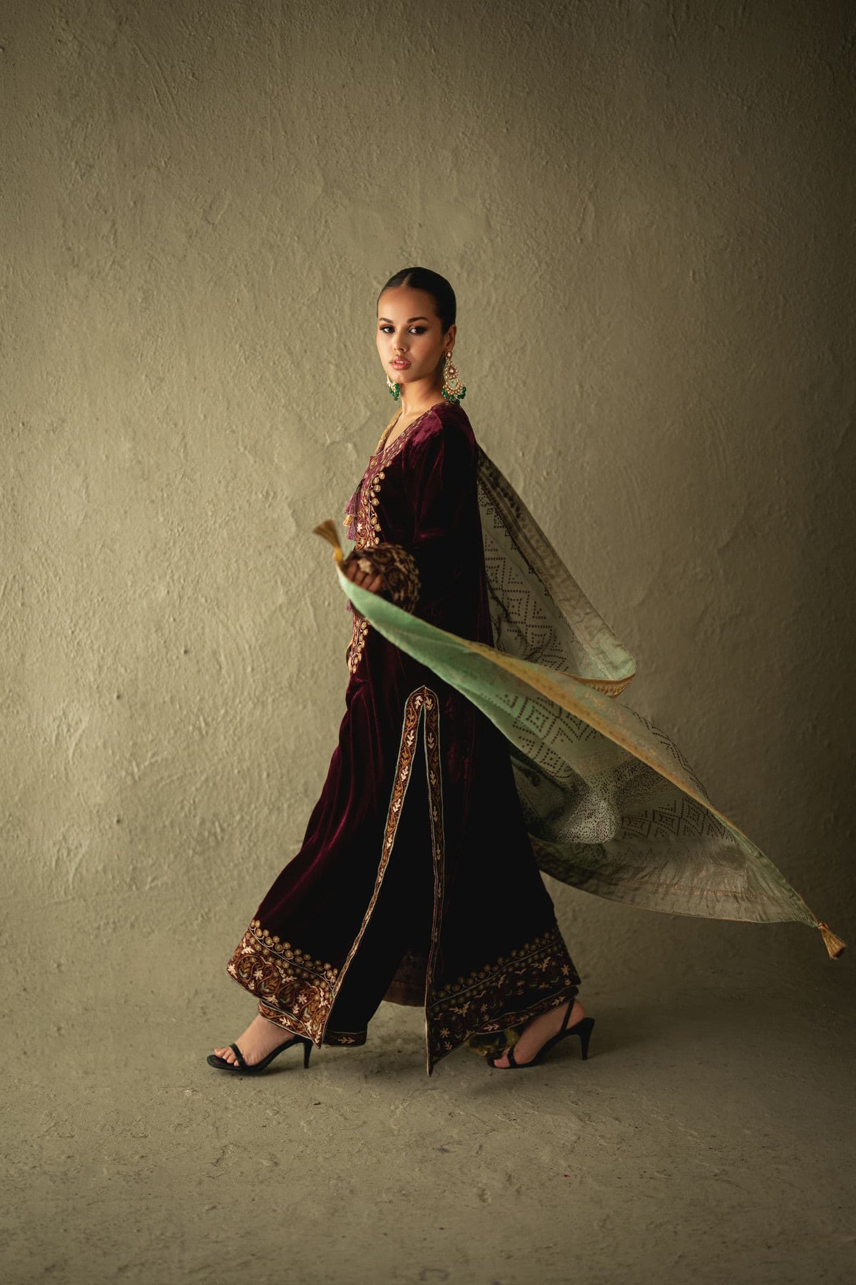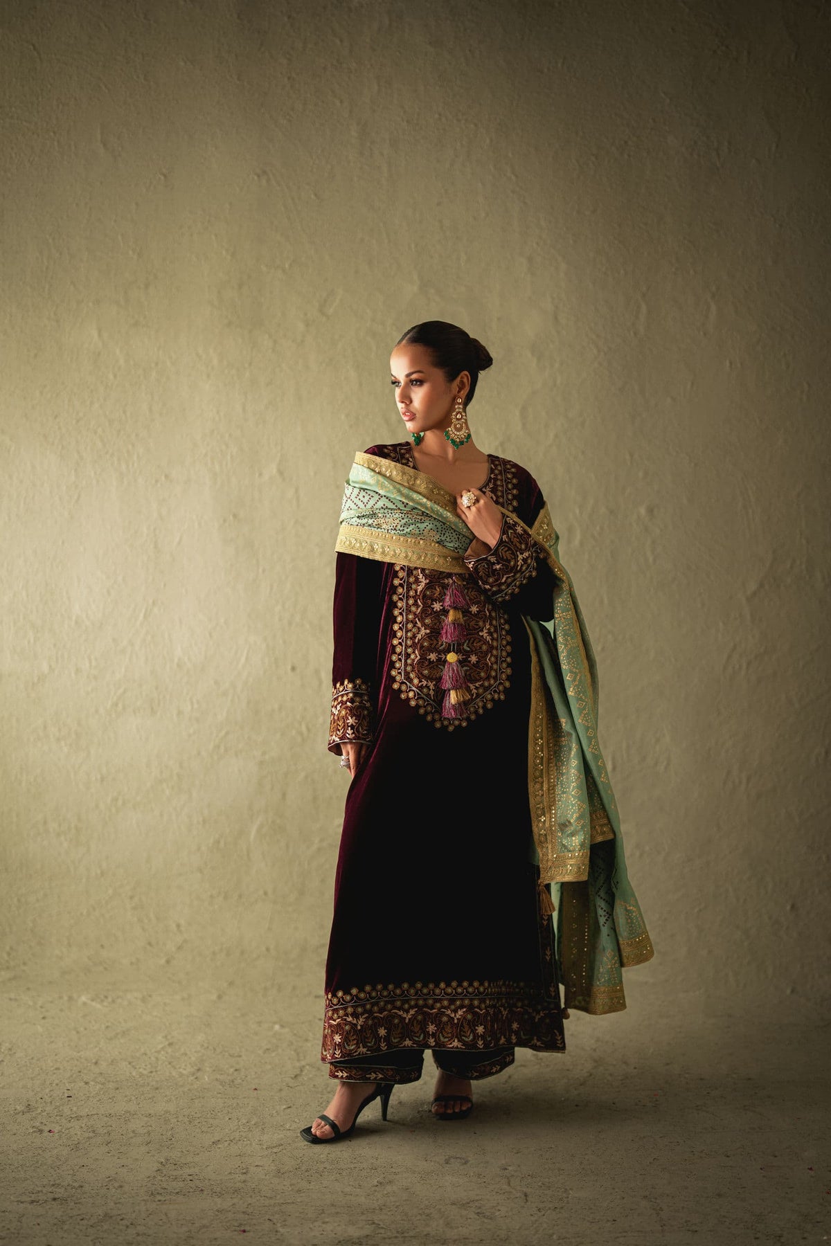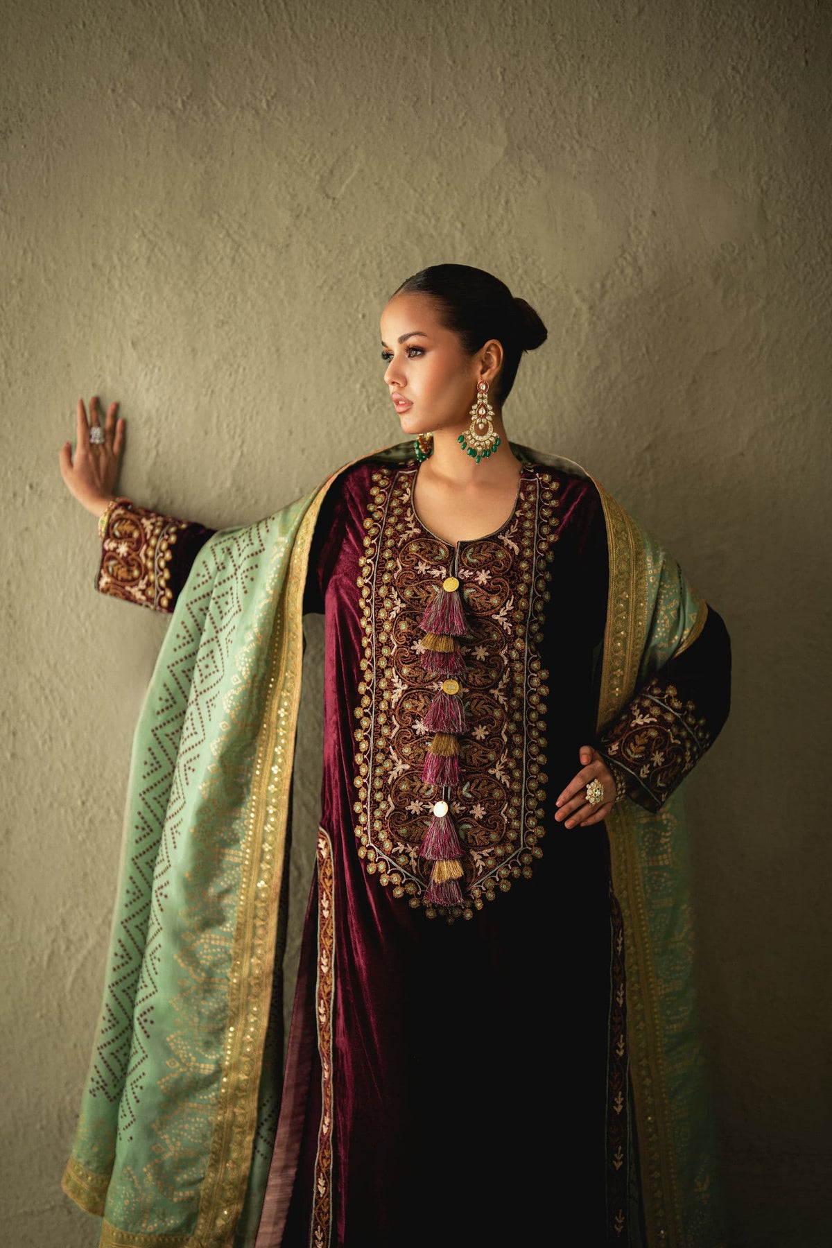 Plum velvet long shirt with antique zari embroidery paired with velvet azaar and sea green block printed chunri dupatta