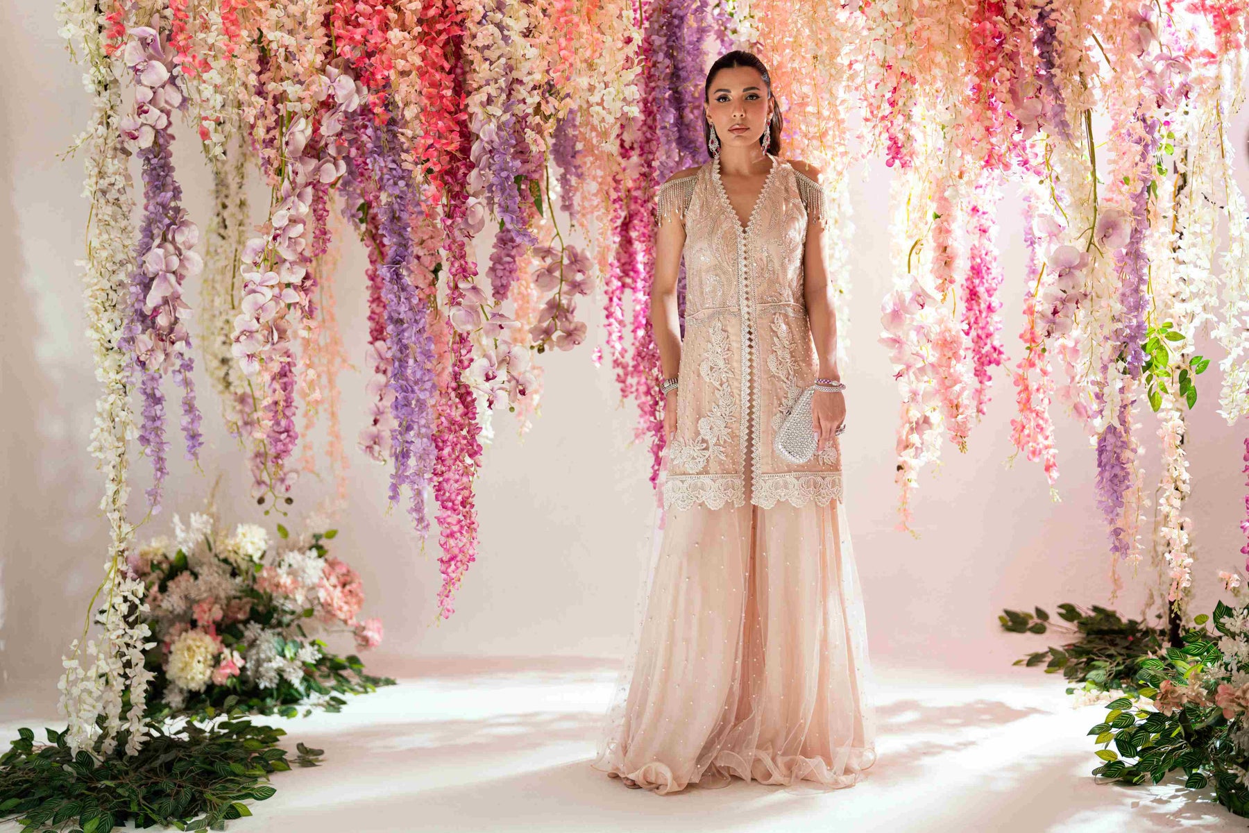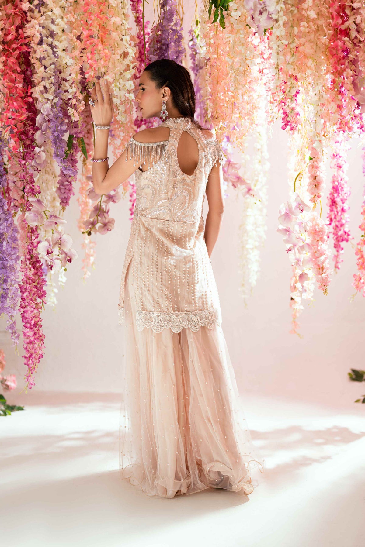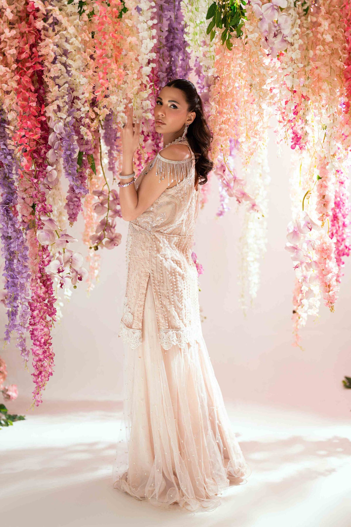 Beige cutwork peplum shirt with pearl detailing paired with dhaka pyjama with pearl & net detailing