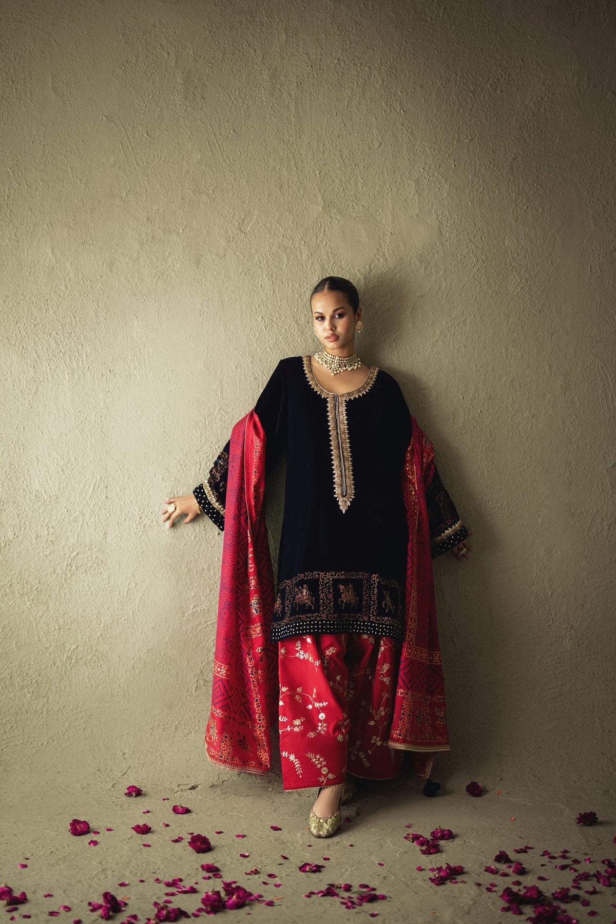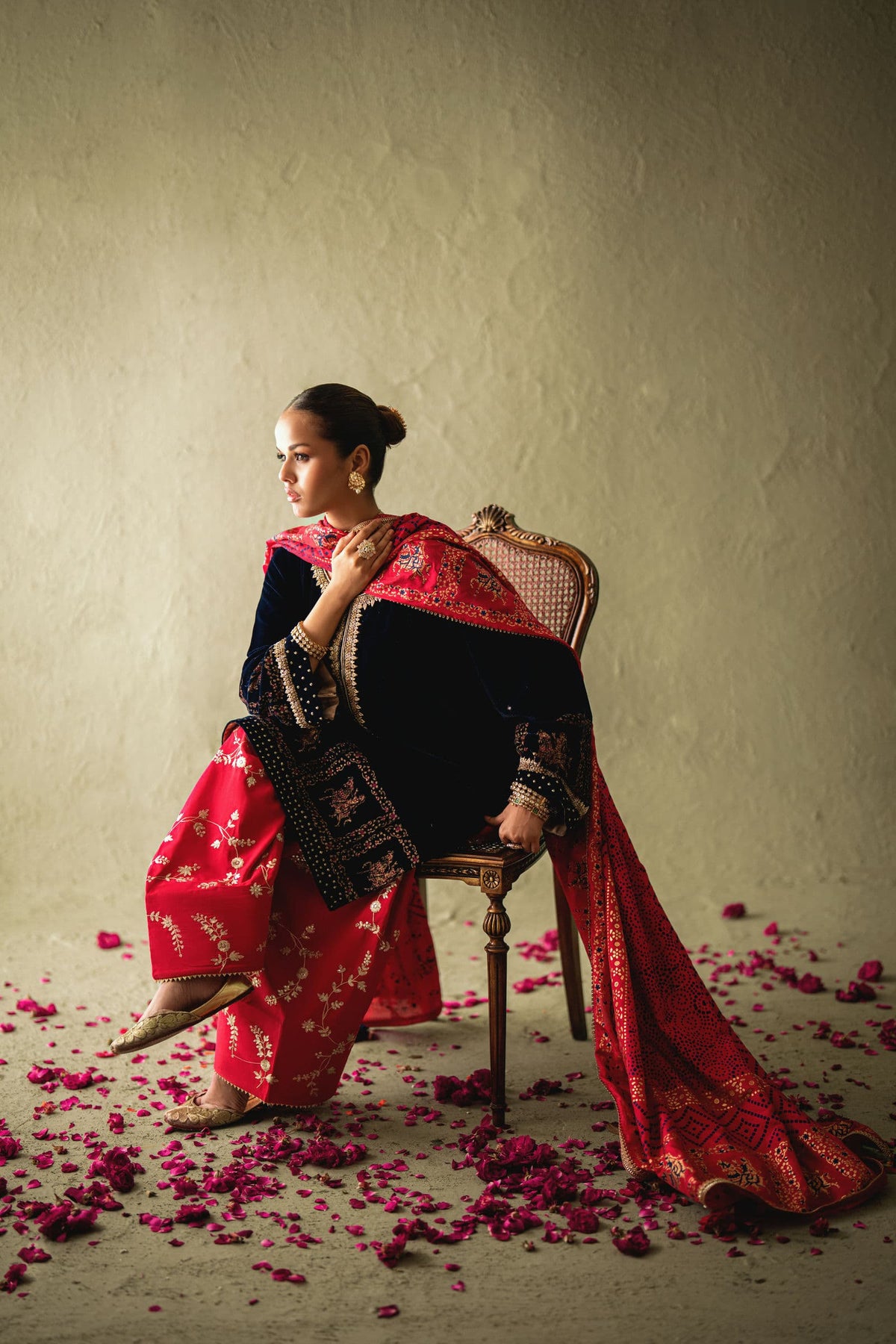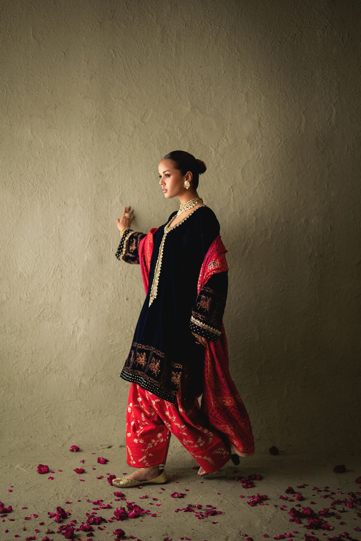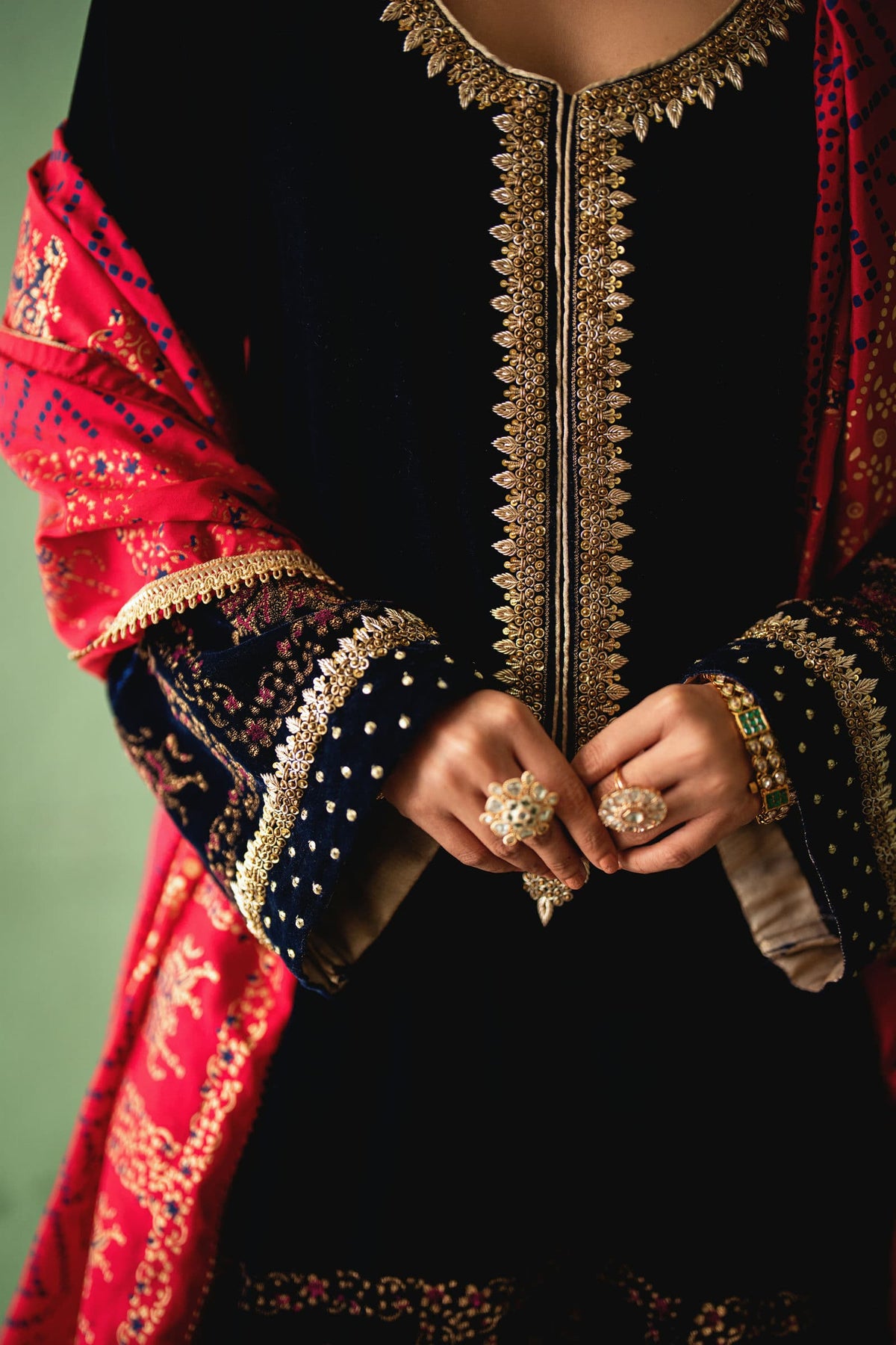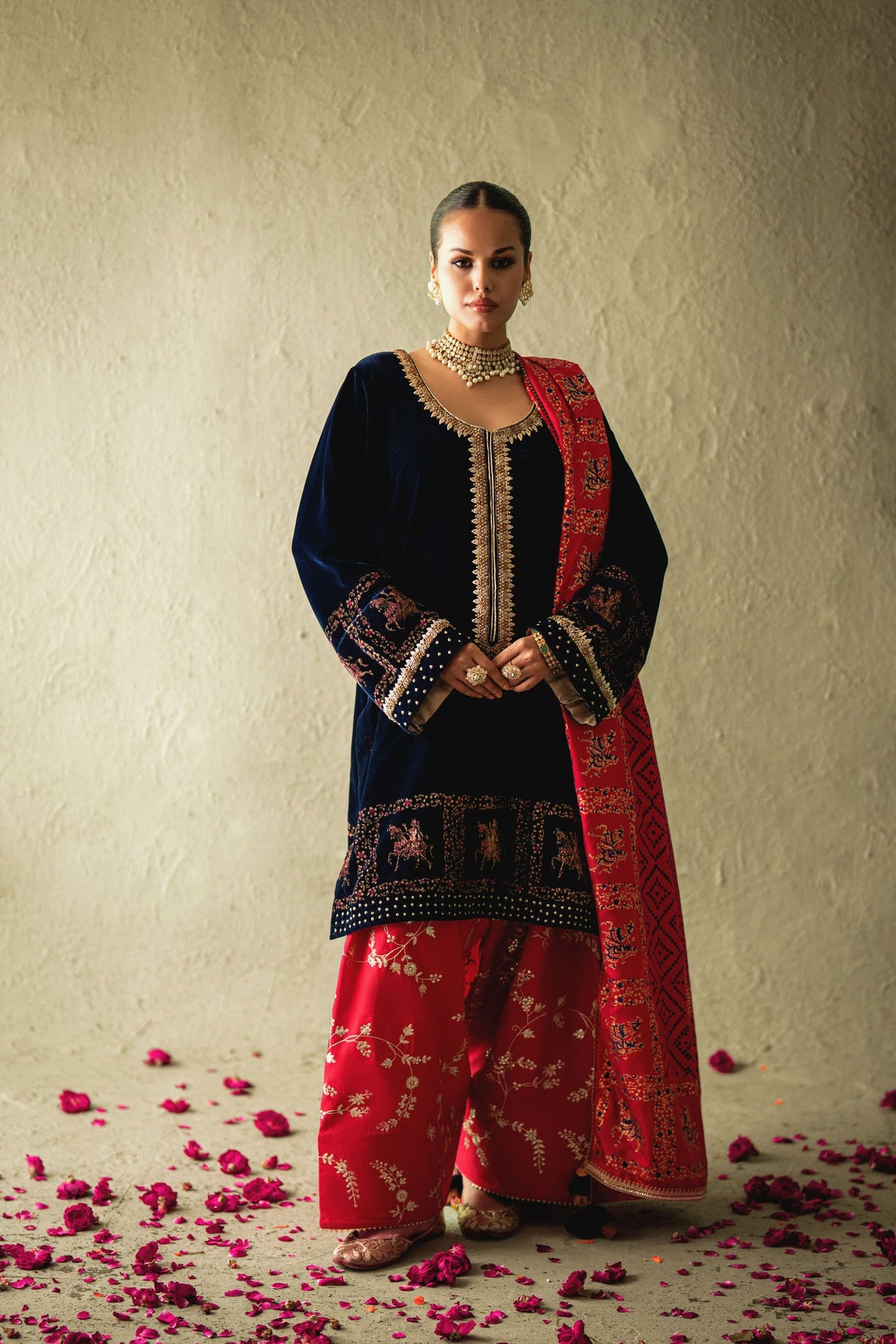 Navy blue block printed shirt with gotaa detailing paired with hot pink farshi shalwar & block printed dupatta with zari detailing