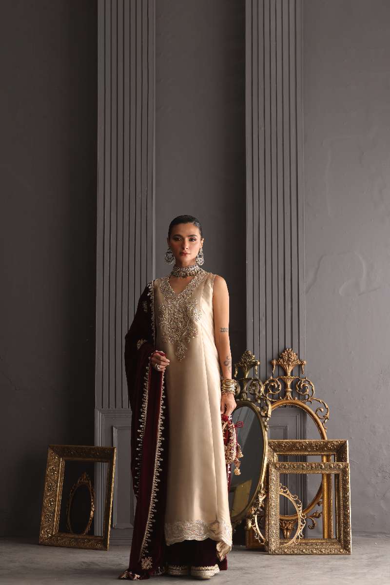 mbrace the festive season with this beautiful long Zari gold shirt featuring baroque hand worked embroidery in zardozi, resham, crystal and french knot. It is paired with a velvet palazzo featuring intricate hand work in zardozi and crystals. This hand embroidered velvet shawl embodies the poetry of luxury and craftsmanship handworked in delicate zardozi, resham and crystals