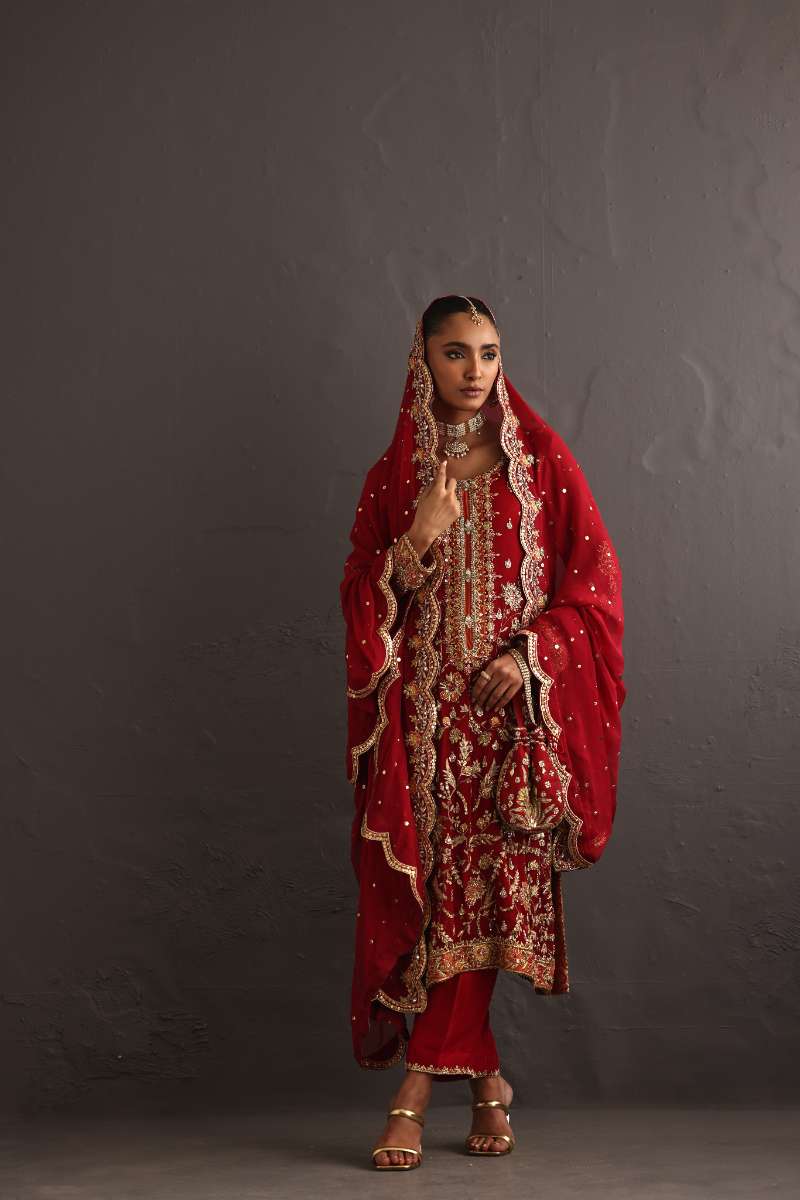 This piece celebrates the poetry of opulence and heritage, rendered in a deep red base that symbolizes festivity and grace. The surface is richly hand-embroidered with zardozi, resham, crystals and kamdani, creating a tapestry of intricate floral vines and ornamental borders reminiscent of mughal jewelry craftsmanship. The shirt and dupatta are crafted from kamdani chiffon and the outfit comes with a pure raw silk