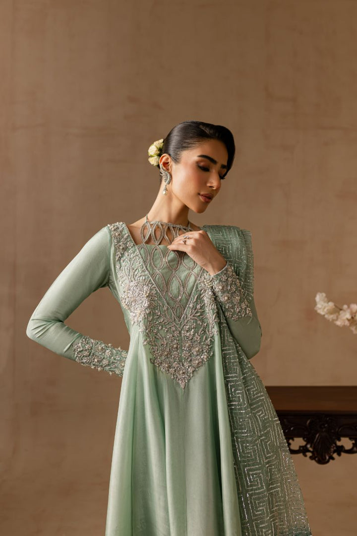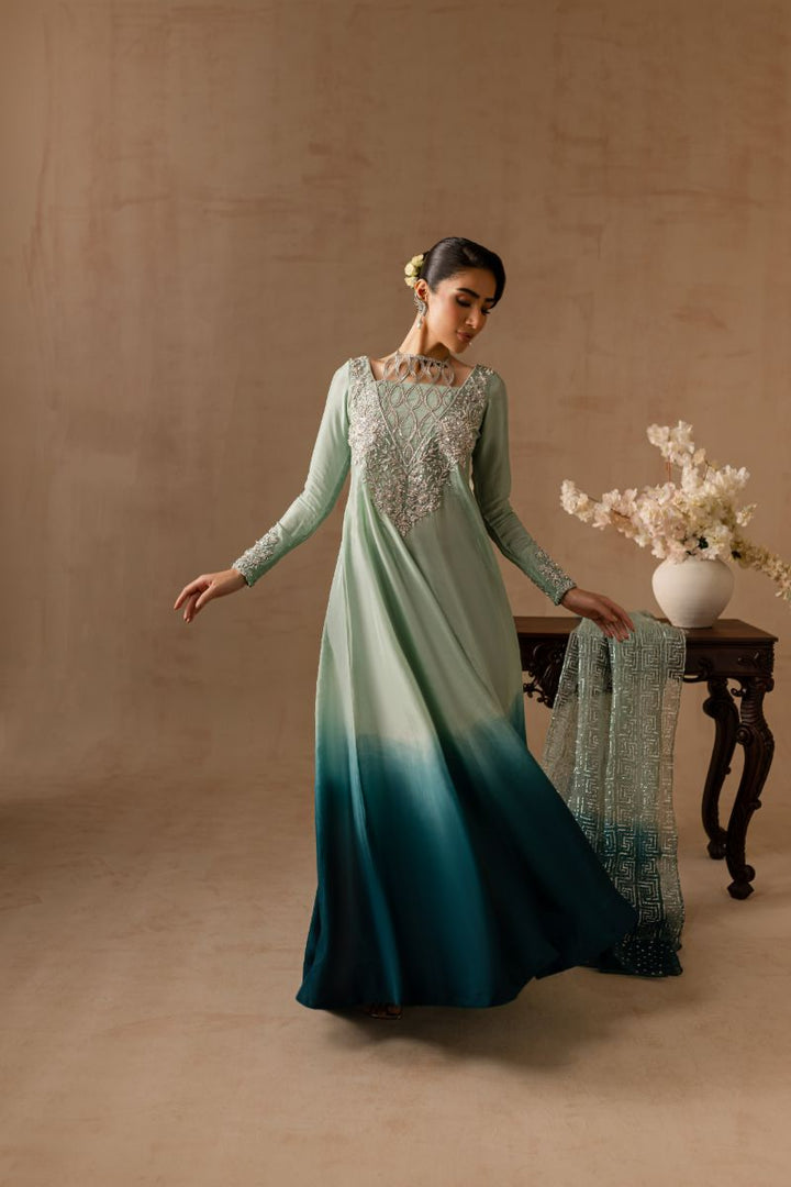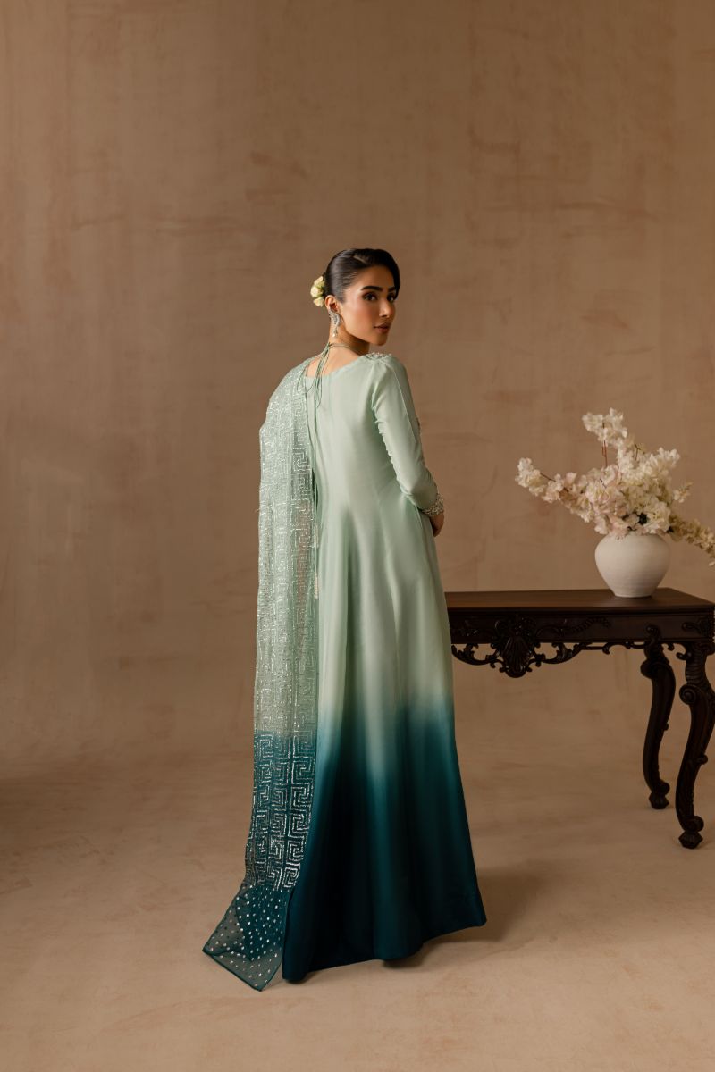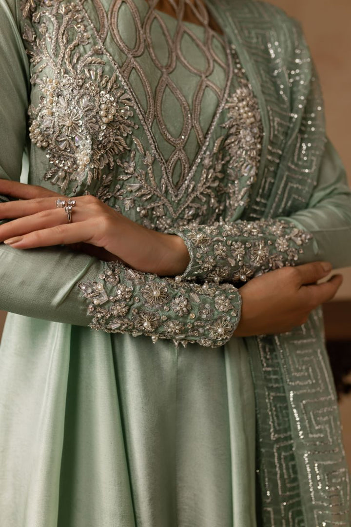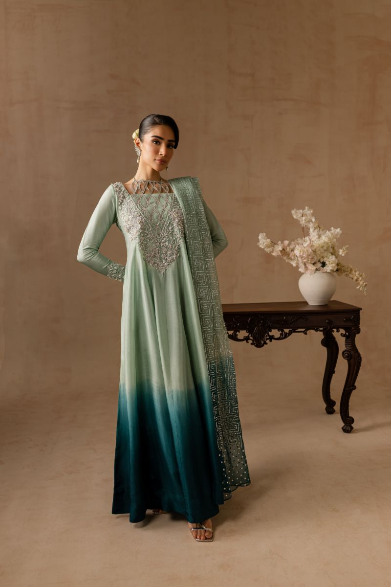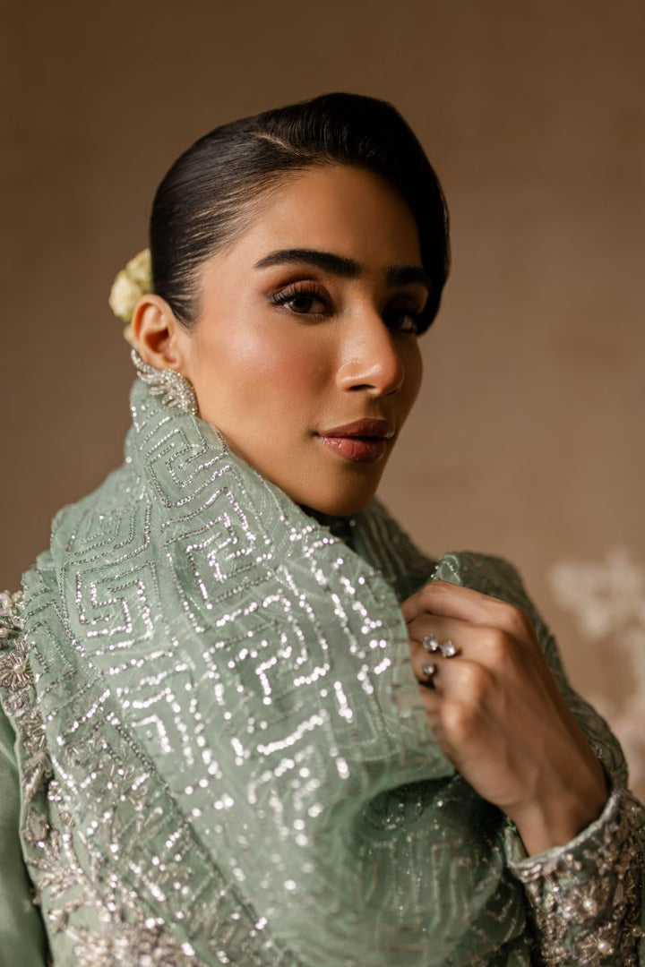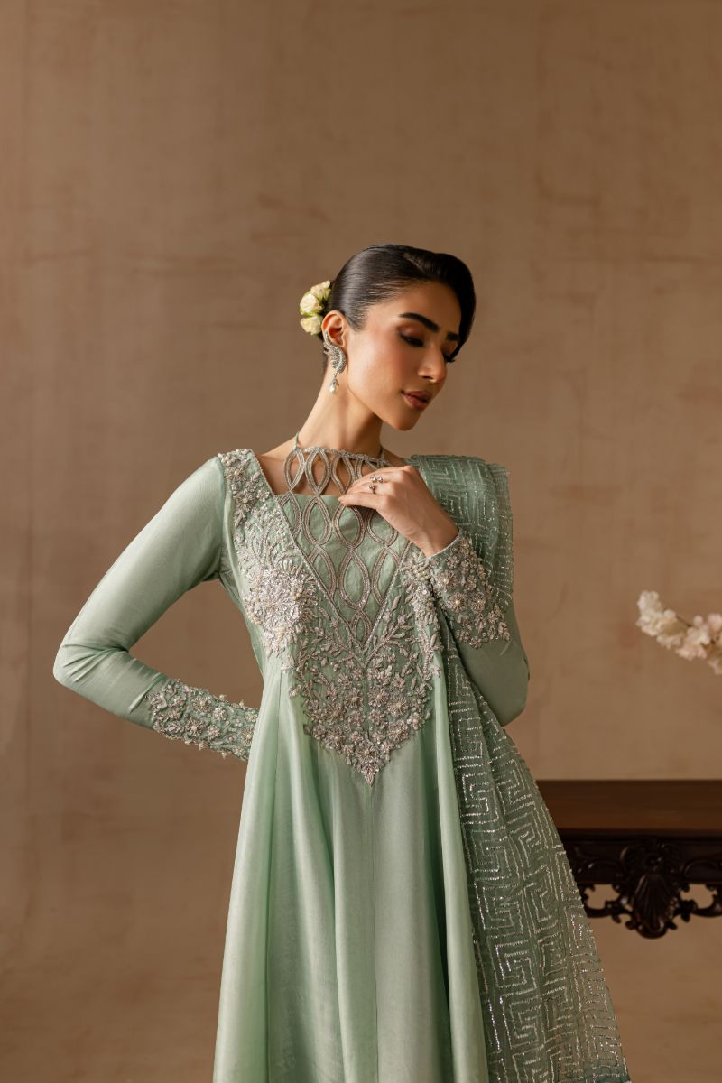 Hand embellished neckline and sleeves with dabka tilla crystals pearls and sequins. Fully embellished organza dupatta.