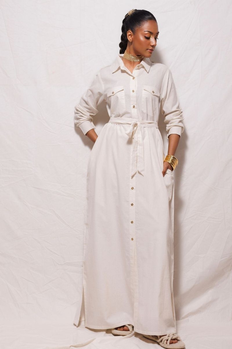 Button down A line dress with front pocket flaps. Adorned with metal gold buttons. Dress has side slits and pockets. Comes with a separate fabric belt.