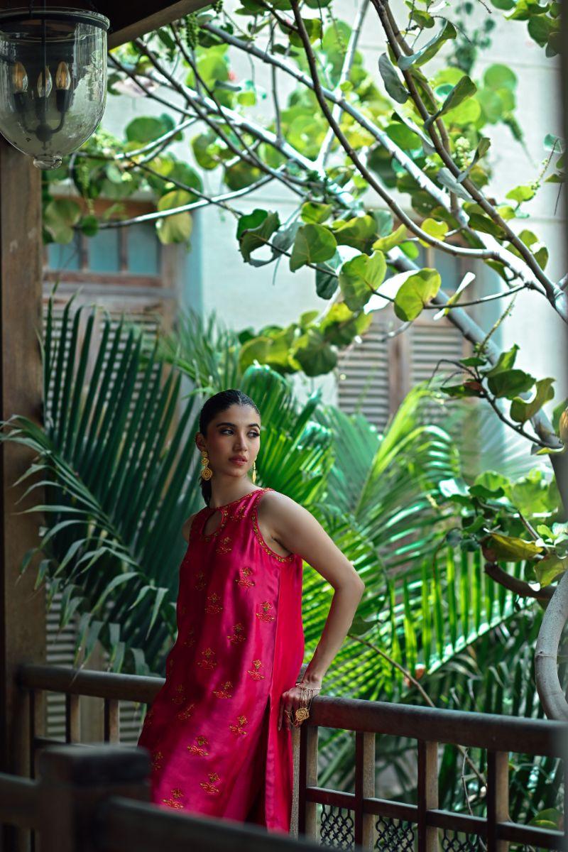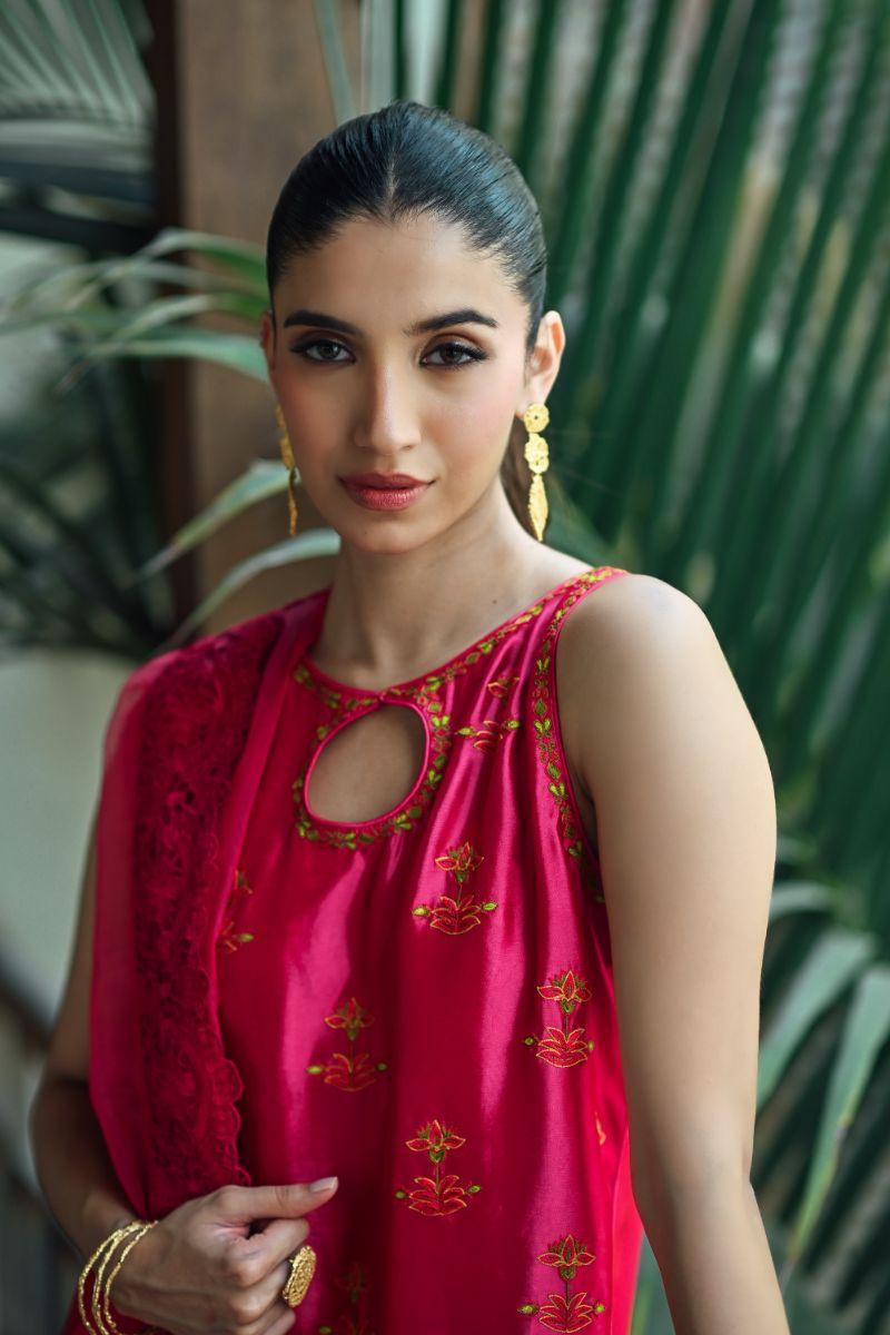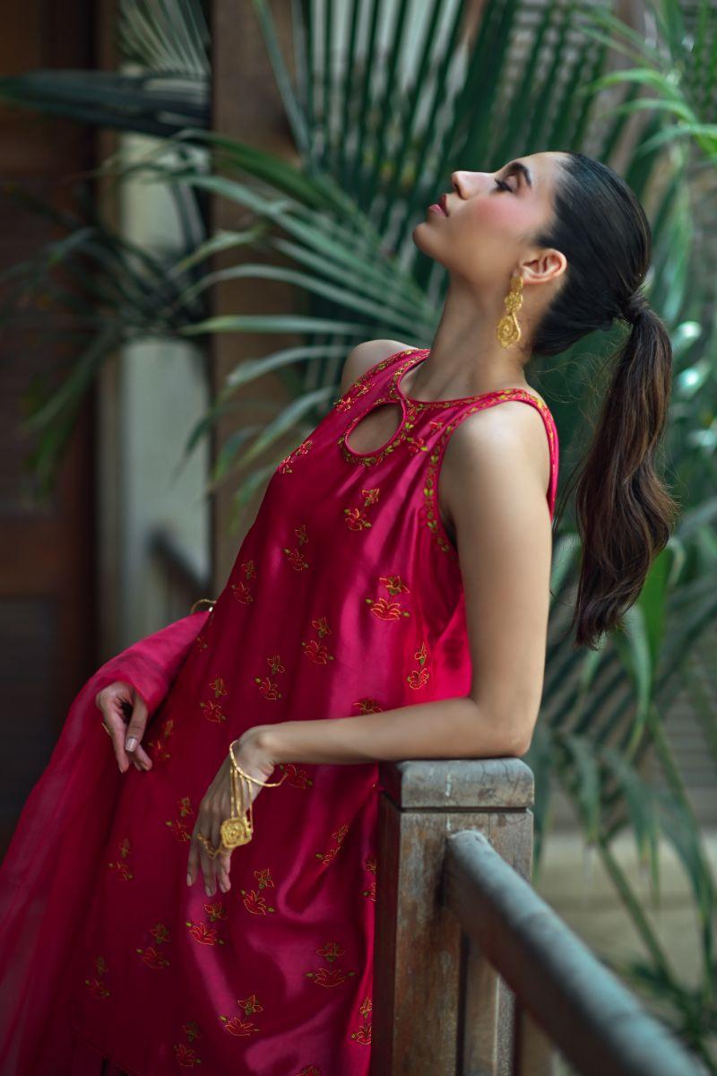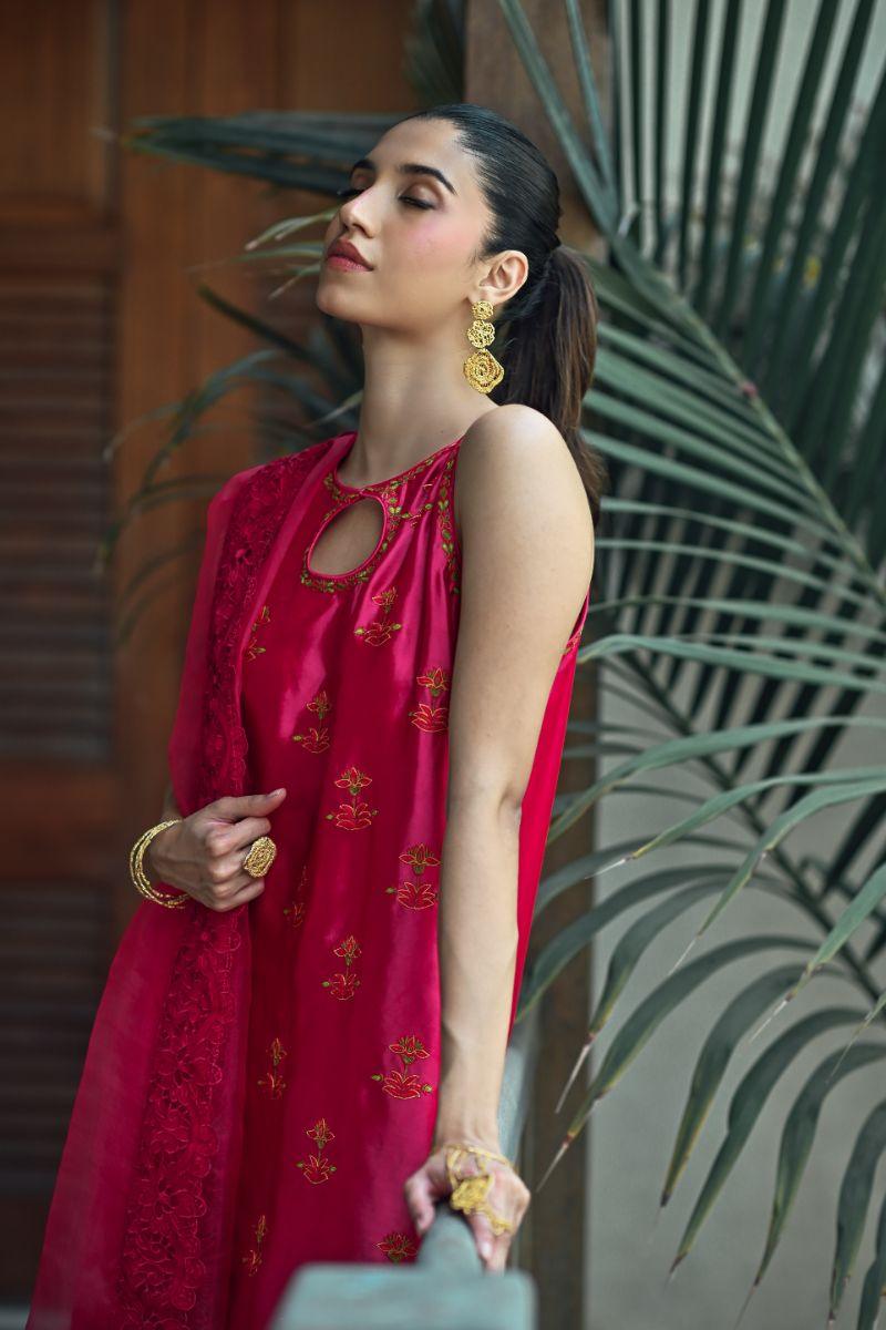 Elevate your style with this stunning hot pink silk ensemble. Intricately adorned with resham embroidery all over, it radiates vibrance and allure. Paired with a complementary organza dupatta and exaggerated silk shalwar featuring embroidery on the pancha, this outfit exudes elegance and sophistication, perfect for any special occasion.