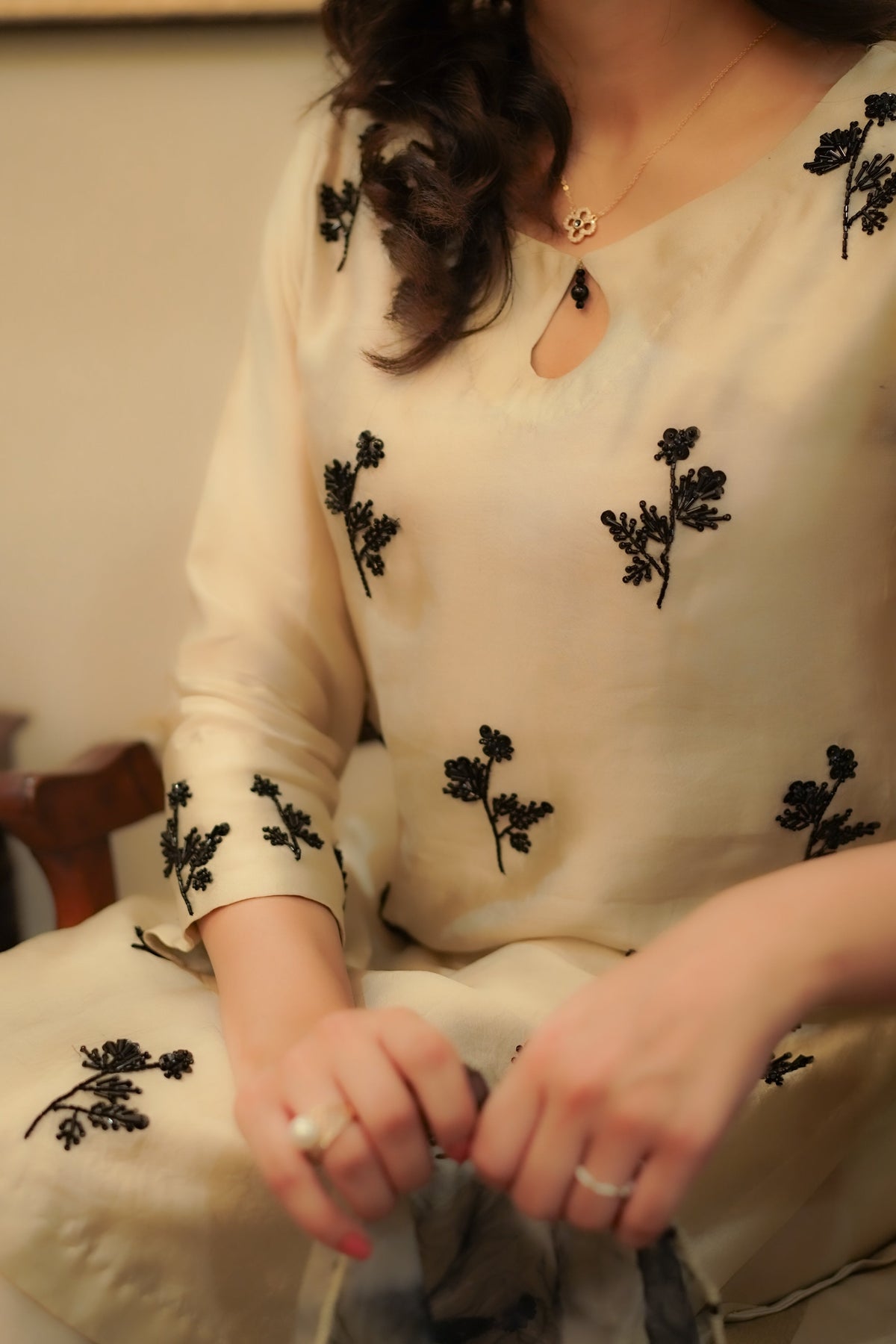 Champagne-colored tissue silk shirt featuring intricate black kut dana motifs that create a striking and timeless contrast. This exquisite shirt is paired with chic wide-leg pants, offering a contemporary silhouette that ensures comfort and style. The outfit is elevated by an electric tie-dye organza dupatta, adding a vibrant and artistic touch that sets this ensemble apart. Perfect for festive occasions, or any special event.