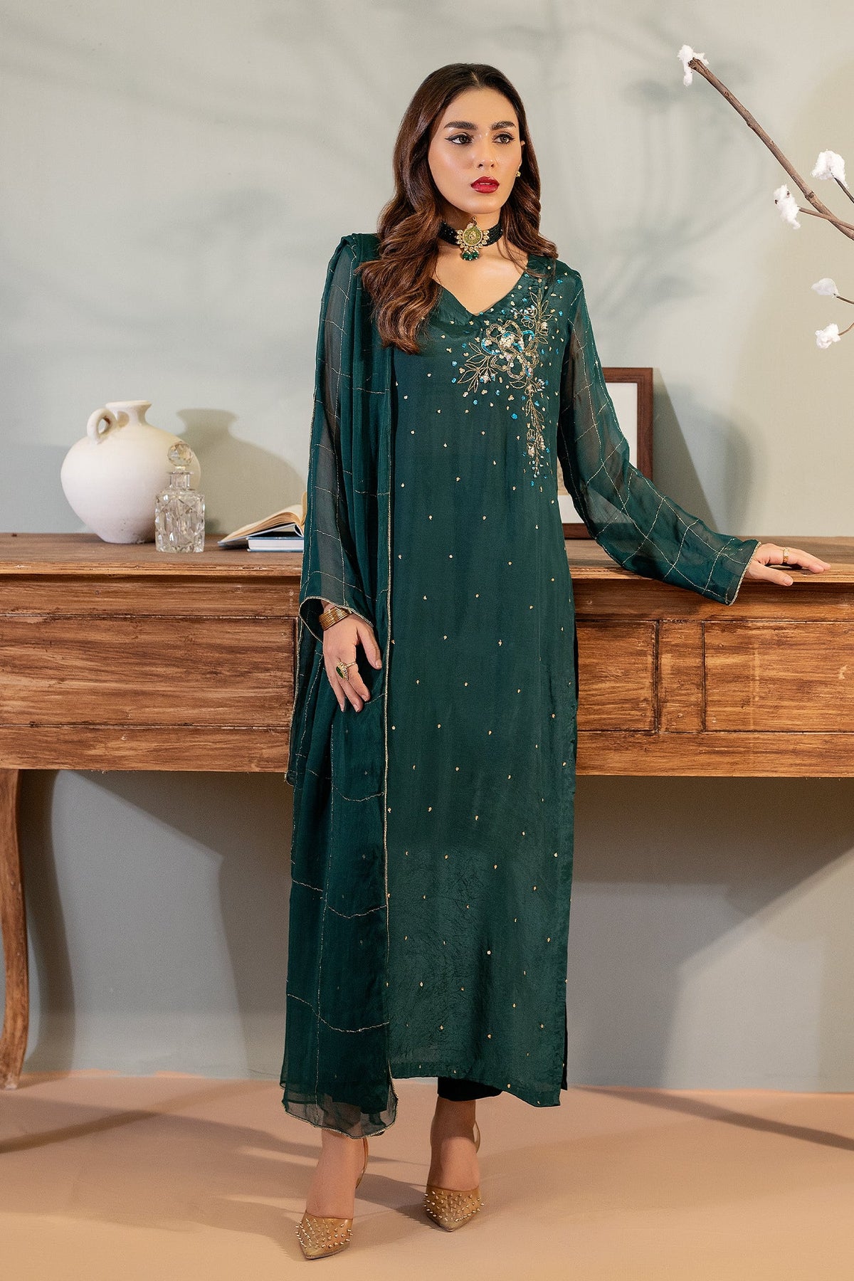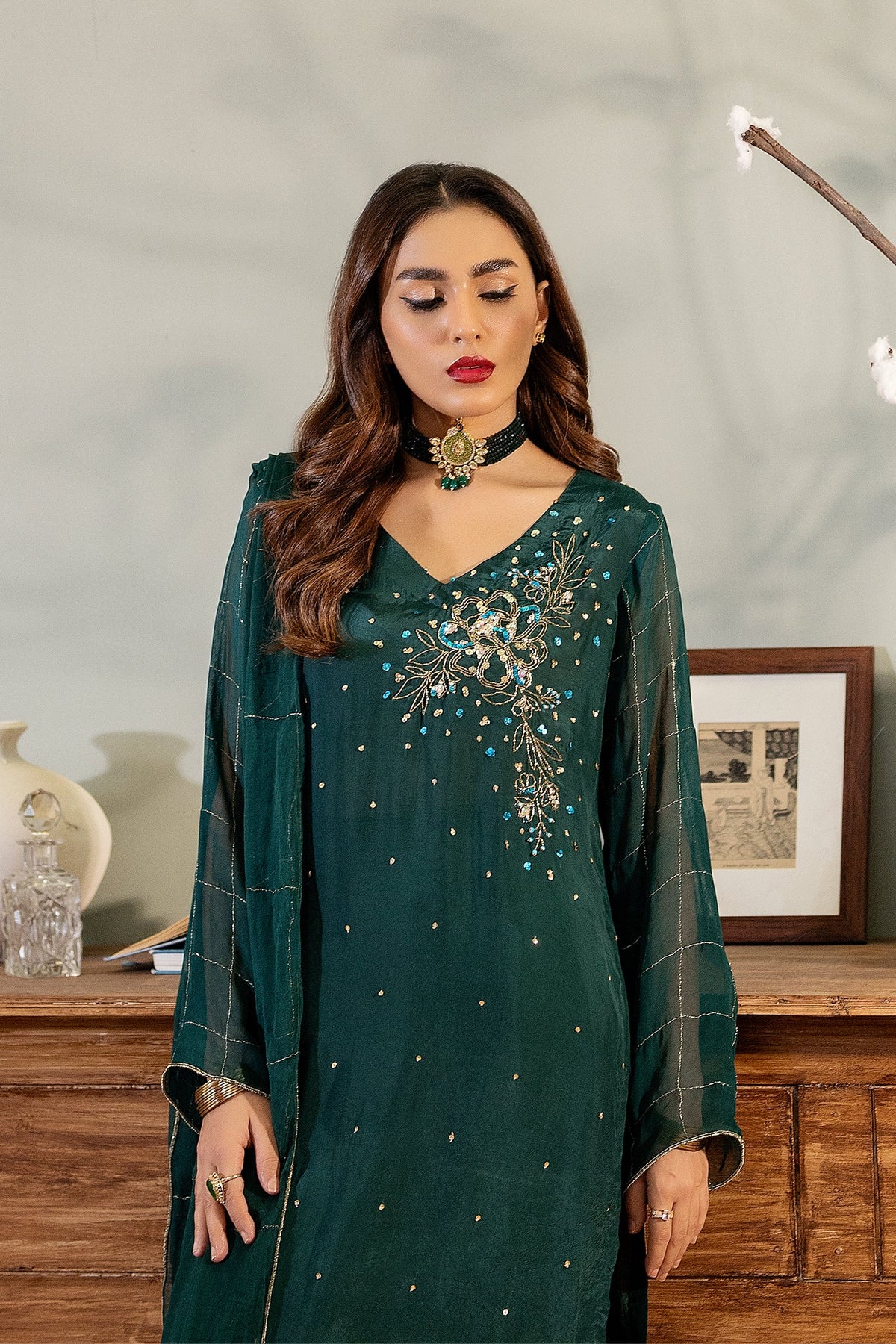 This deep emerald green dress with a sleek and refined silhouette. The V-neckline is beautifully adorned with intricate gold and blue floral embroidery, adding an elegant touch to the upper portion. The dress features a subtle grid pattern and delicate golden embellishments scattered across the fabric. Paired with a matching dupatta that mirrors the grid design, the outfit exudes a regal and sophisticated aura, making it ideal for formal gatherings.