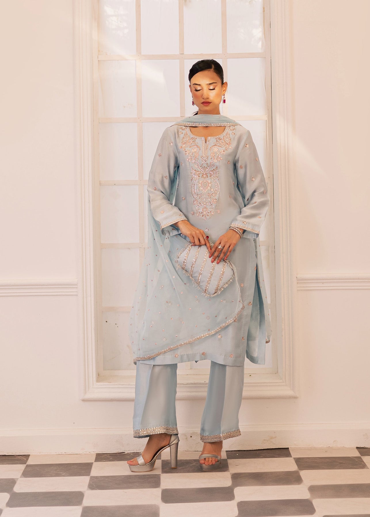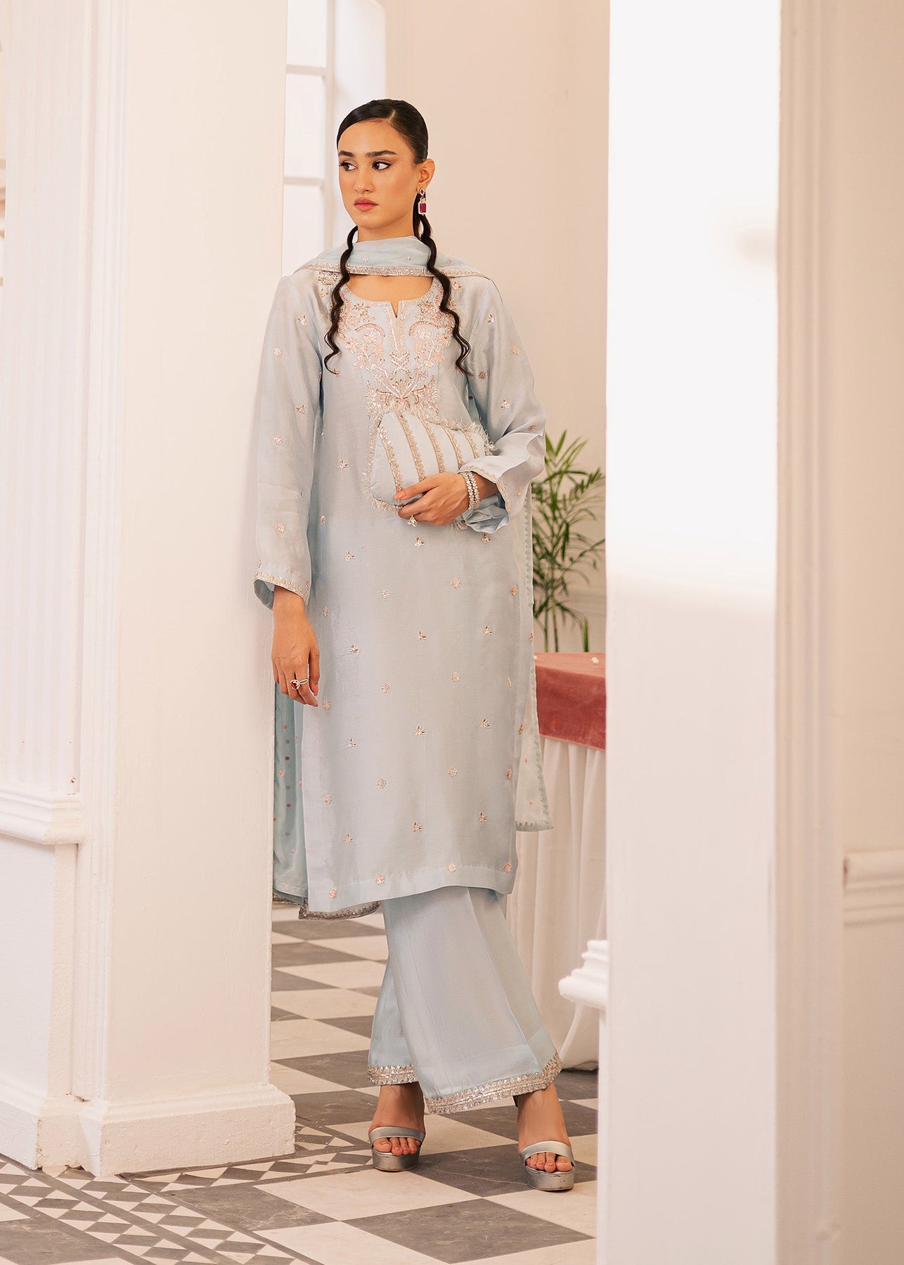 Graceful, refreshing, and effortlessly refined — this three-piece ensemble is crafted in a serene ice-blue shade, bringing a soft, soothing charm to your festive wardrobe. The straight-cut shirt features intricate tone-on-tone embroidery highlighted with subtle pink and silver threadwork, adding depth and delicacy without overpowering the look.