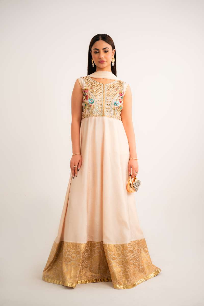Product Description: vory Bloom is crafted in Korean raw silk and features a fitted top with gold resham embroidery and colorful floral detailing. The skirt flows beautifully and is finished with a wide golden border at the hem. At the back, a bold pink and teal color-block detail adds a modern, playful twist. Colour Wide Golden , Details of Fabric Korean Silk , Dupatta Shiffon 2PC Suit