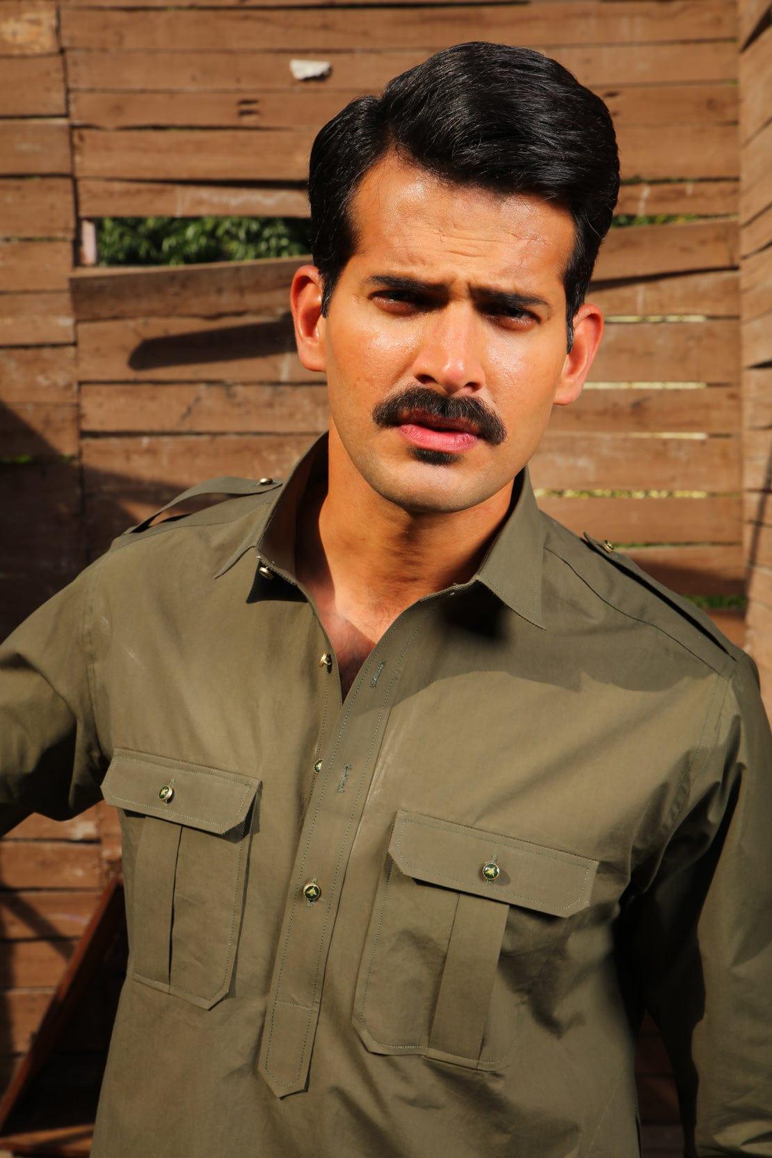 This army green kameez is made from a mix of pima cotton blend with a light starch finish. The kameez has double flap pockets with a box pleat and custom metal button detailing on each side of the front along with shoulder straps. The classic kameez collar has three custom metal buttons to finish the look. The kameez has plain straight sleeves with buttoned cuffs and the white cotton trouser is also a straight cut with side pockets.
