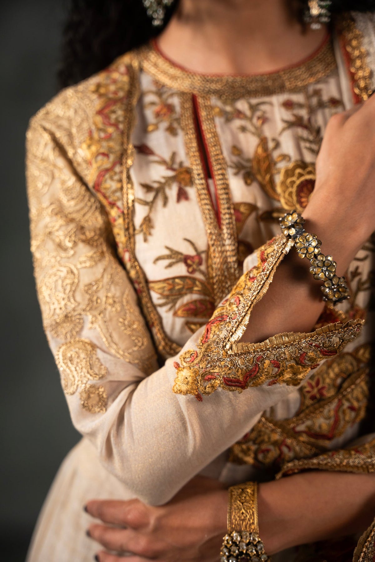 Masori Rajistani peshwas with its flowing silohouette, is intricately rendered with gold embroidered heavy borders featuring an embroidered neckline cream kimkhawab churi pajama is perfectly accompained by flowing embroidered dupatta with borders