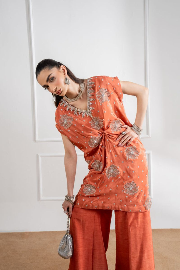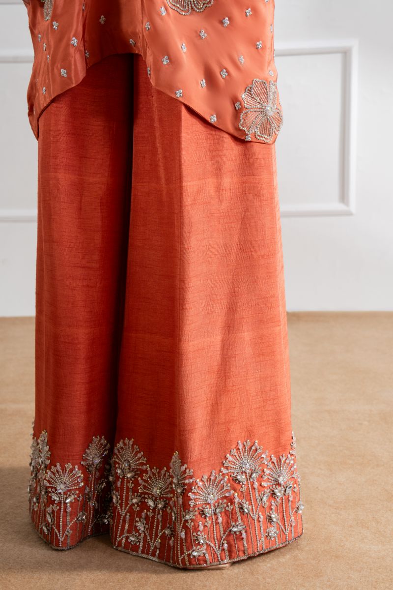 Fully hand embellished draped shirt with front slits open paired with Hand embellished flared pants.