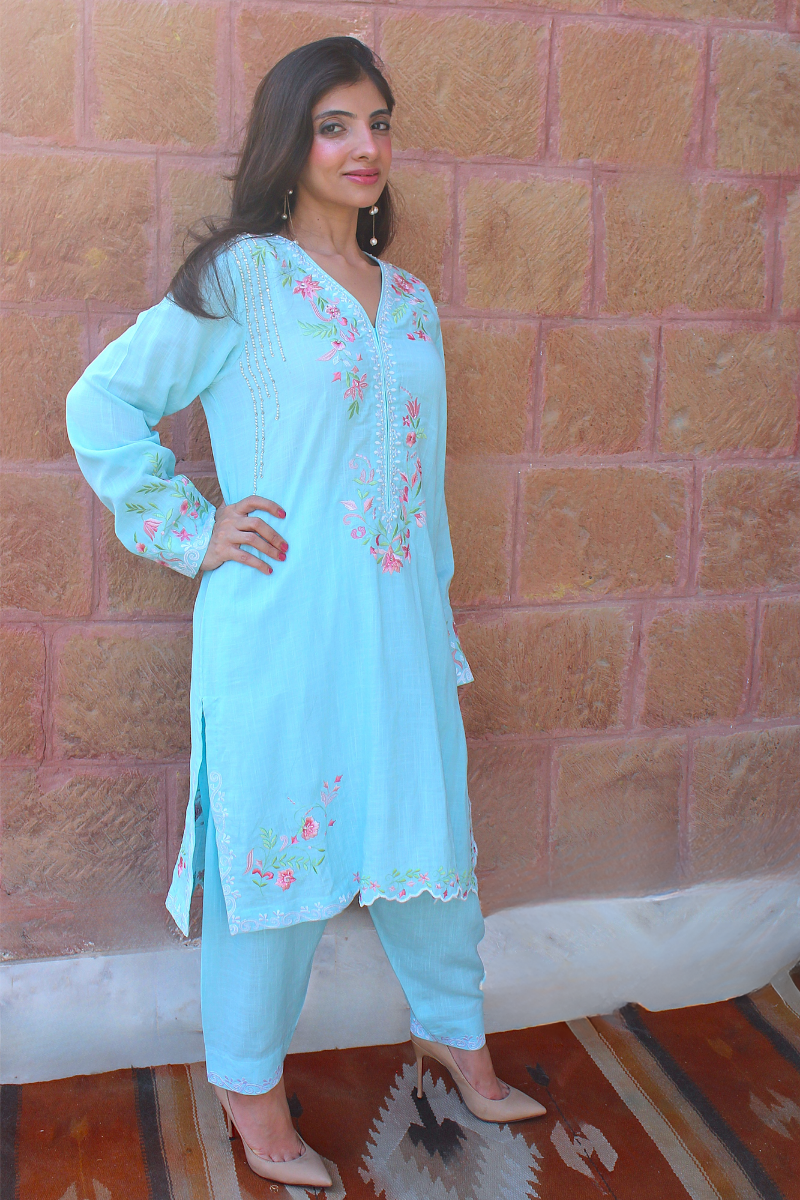 Embroidery on Neck, sleeves & borders with diamentes & pearls detailing on shoulders and embroidered trouser