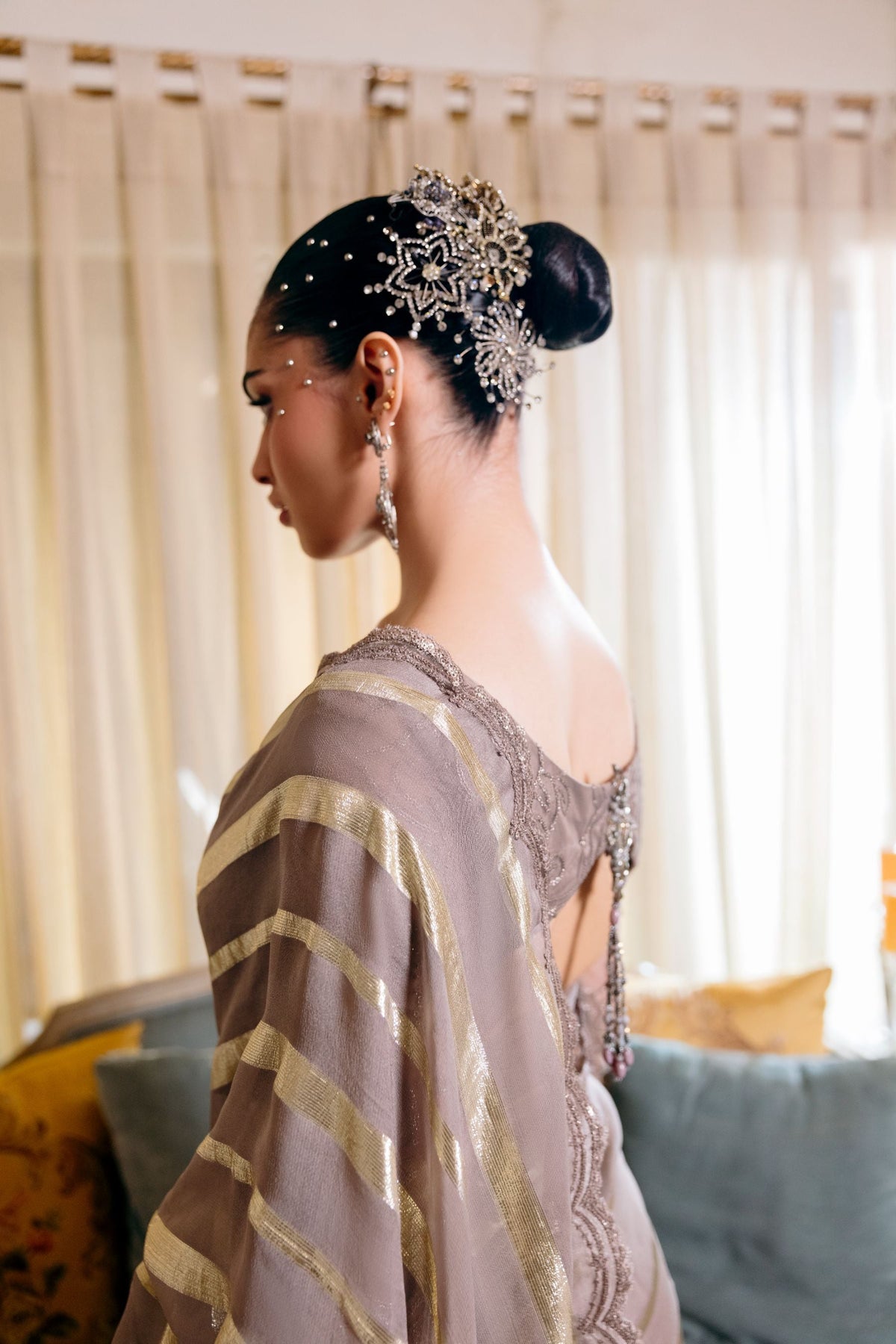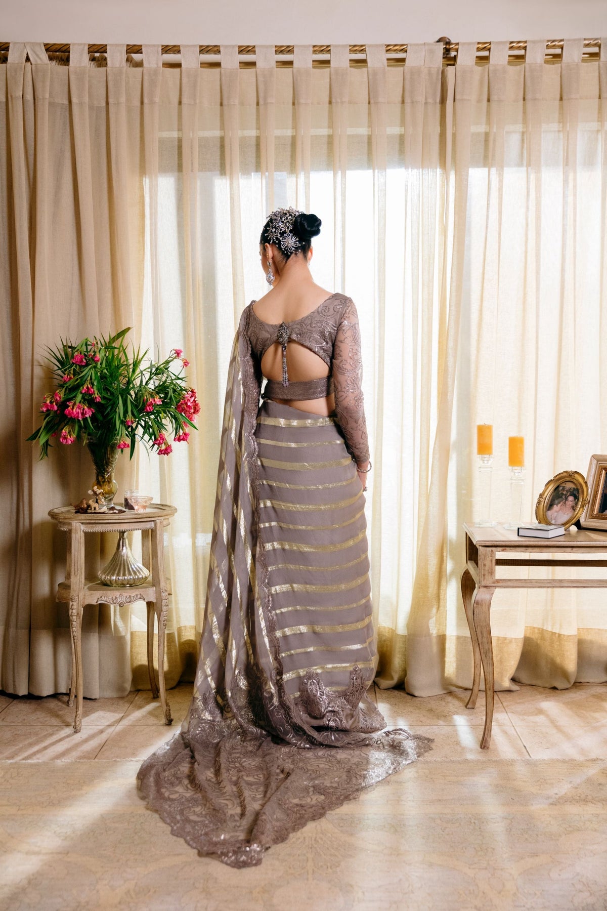 The blouse is the statement feature — intricately hand-embellished with tonal embroidery and crowned with a couture jewel centerpiece at the neckline. Sheer lace sleeves paired with a dramatic cut-out back, finished with tassel detailing, transform the ensemble into a sculpted masterpiece.