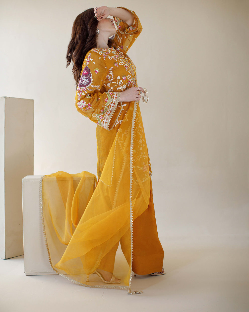 Ombrella - Sunshine Mustard Khaadi Net Suit For Women - 3 Piece