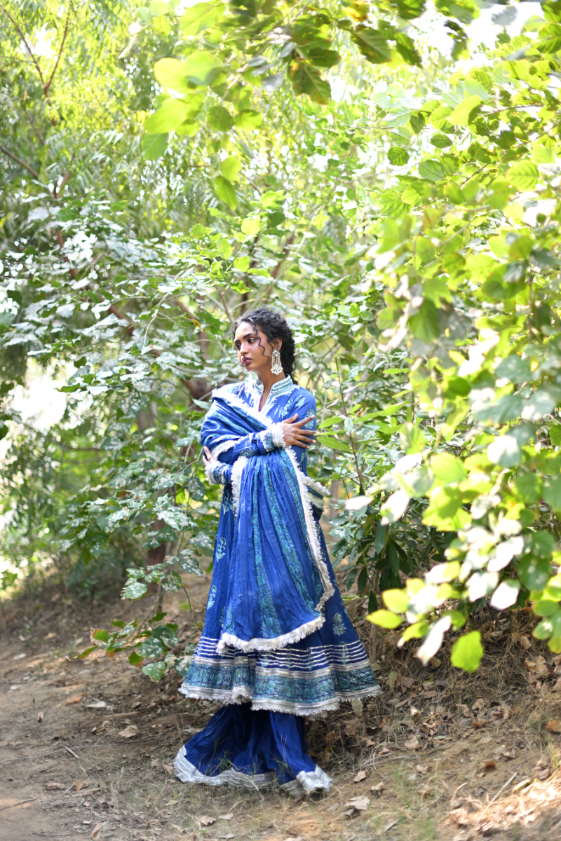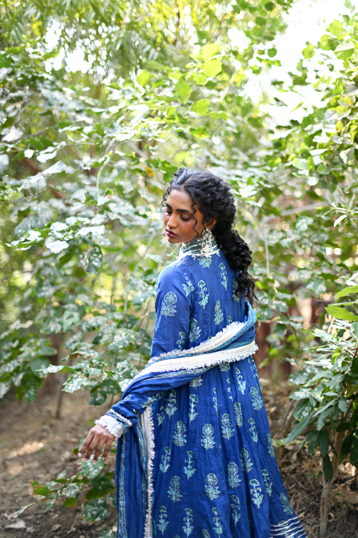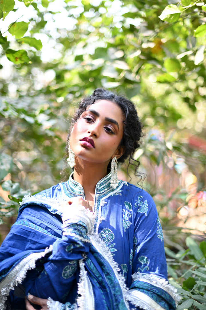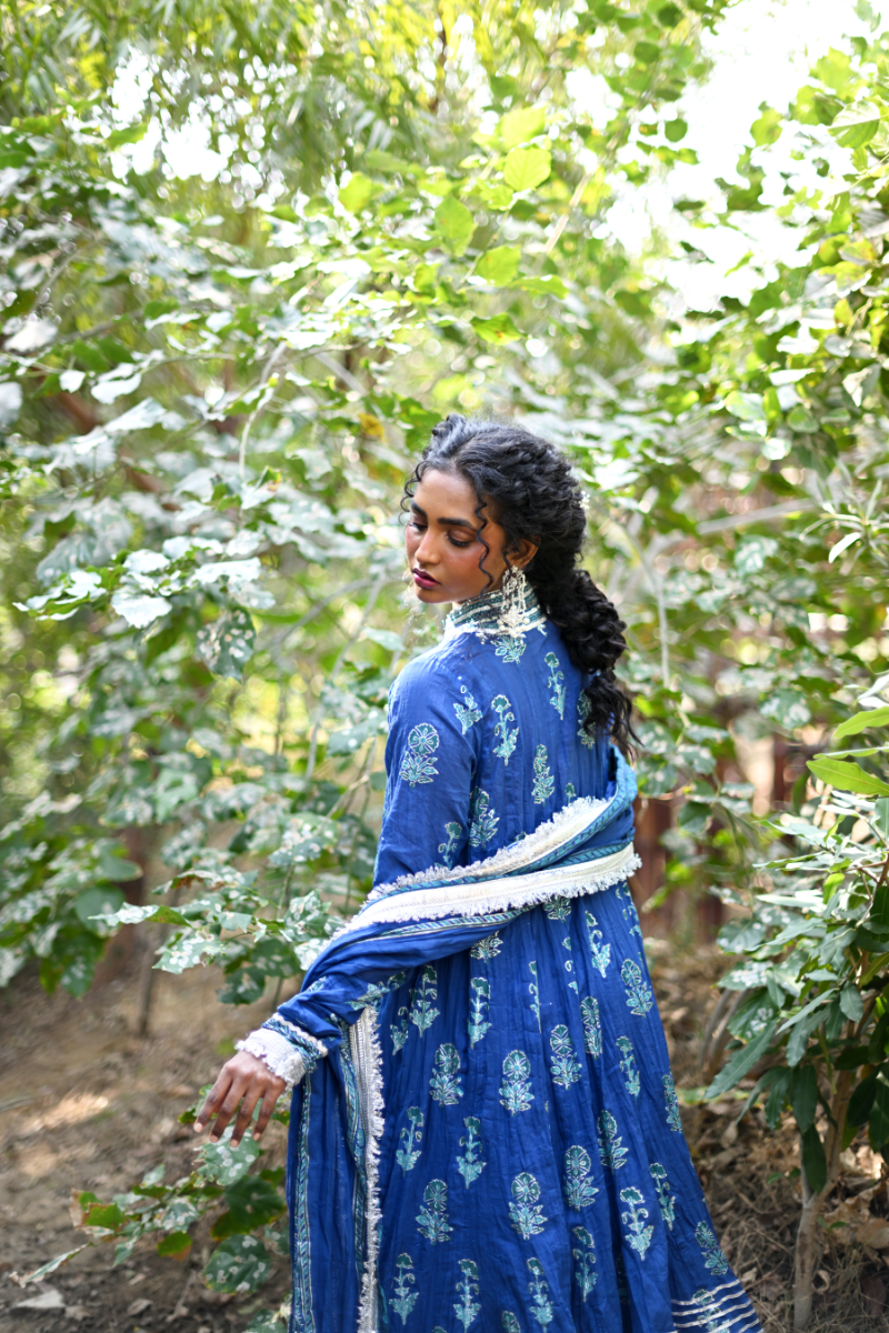 Inspired by the beauty of midnight flowers, this 64-kali outfit features intricate floral block-printed motifs in shades of blue and silver. A perfect balance of mystery and grace, the deep color palette and flowing handwoven malmal fabric transports you to an enchanted garden under a velvet sky. This outfit is finished with delicate gota detailing and is paired with a matching block-printed dupatta and Dhaka pajama, creating a timeless look that blends elegance with the allure of midnight bloom.