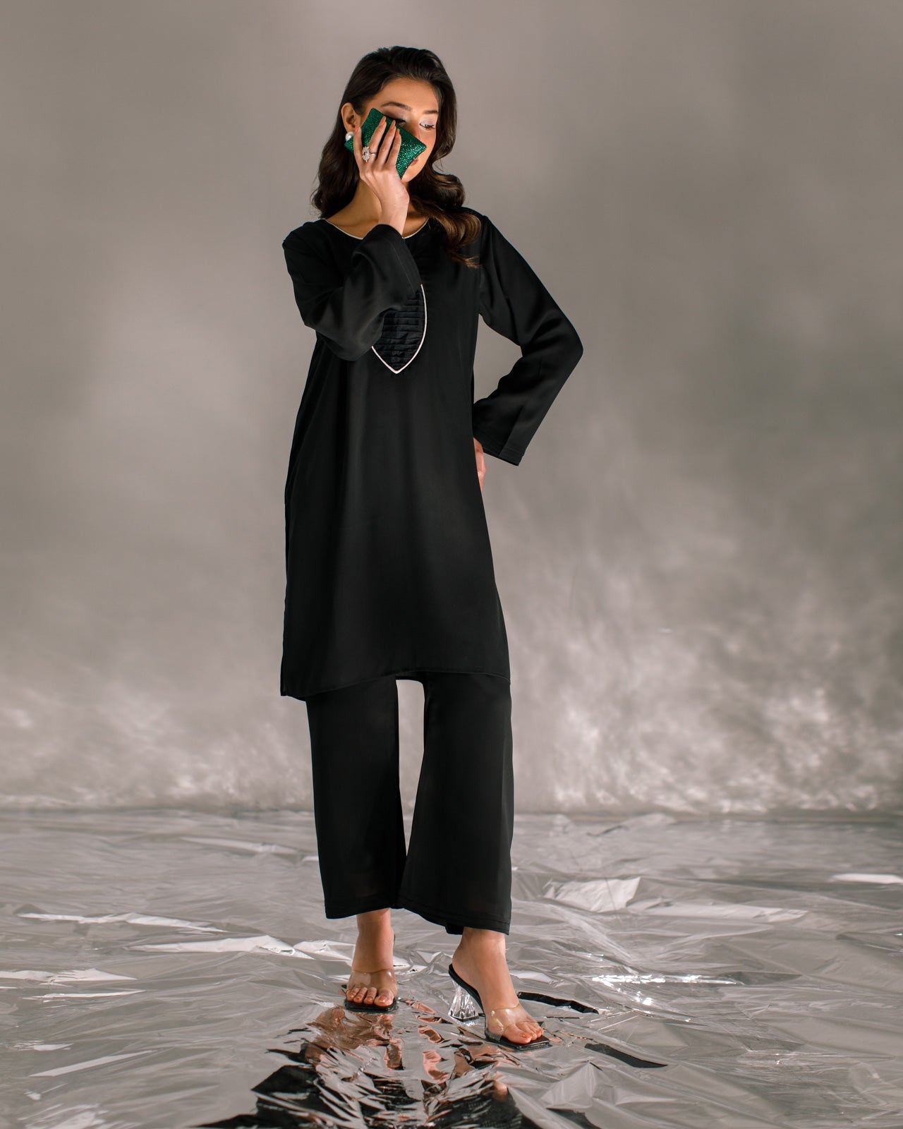 This chic all-black two-piece set features a flowy tunic crafted from lightweight, breathable fabric, paired with matching culottes for a modern, comfortable silhouette. The tunic is subtly detailed at the neckline, adding a touch of elegance without compromising its minimalist charm