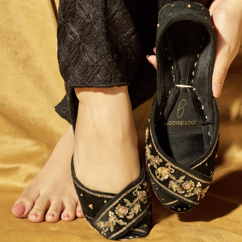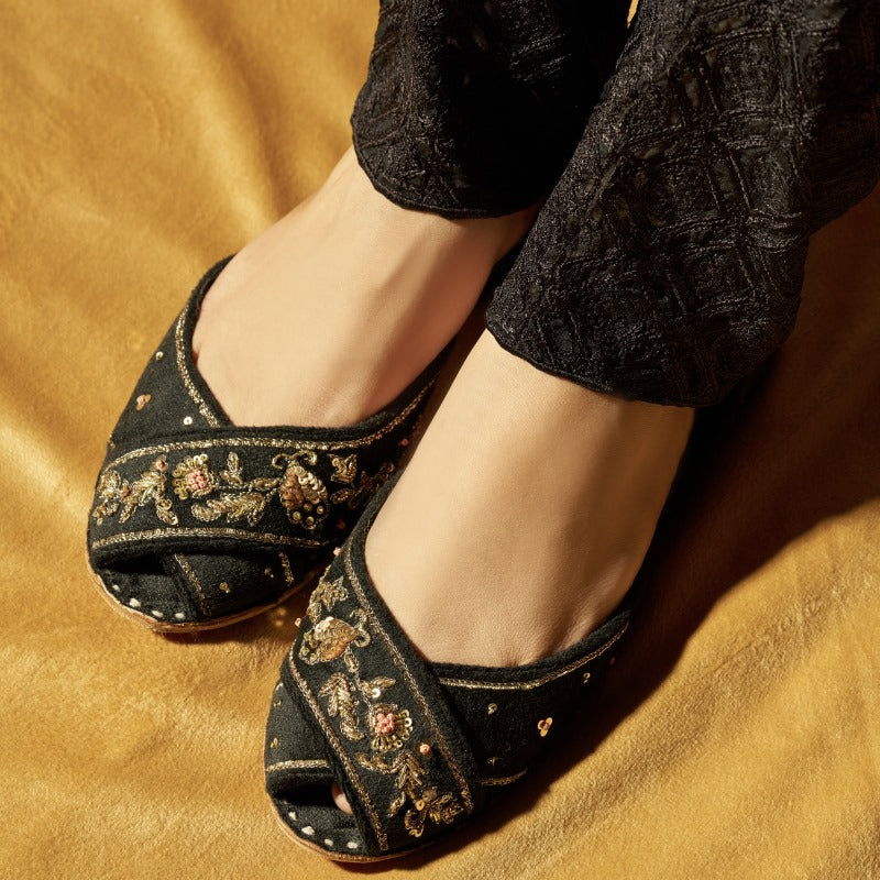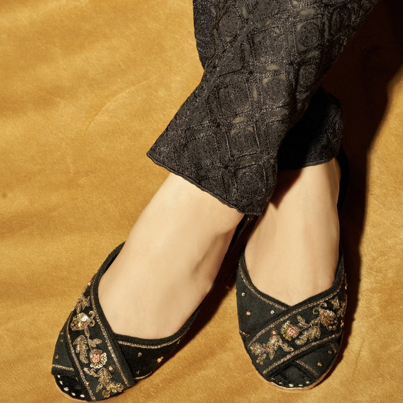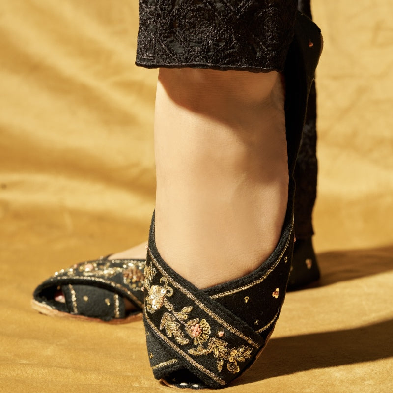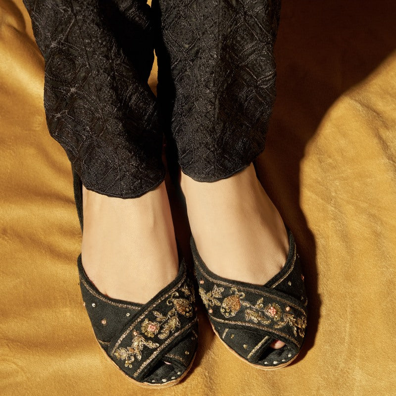 Introducing our majestic black peshawari khussa, a stunning pair of traditional shoes that blend elegance with vibrant craftsmanship. These beautifully embroidered peep toes feature a rich black fabric adorned with intricate gold and colorful floral patterns, complemented by detailed paisley designs. The soft, cushioned insole ensures all-day comfort, while the durable sole provides excellent support and longevity. Perfect for special occasions and everyday wear, these peep toes add a touch of sophistication and cultural charm to any outfit. Embrace the blend of tradition and style with these exquisite juttis that are sure to turn heads wherever you go. Pair them with your favorite traditional attire or modern outfits to add a splash of color and elegance to your ensemble.