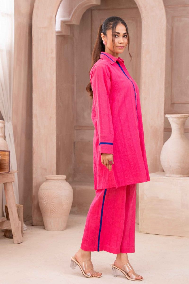 Pink Ocean co-ord design with a beautiful western look. This collared shirt has blue piping running across the side of the shirt down to the hem of the baggy trousers that go along with it.