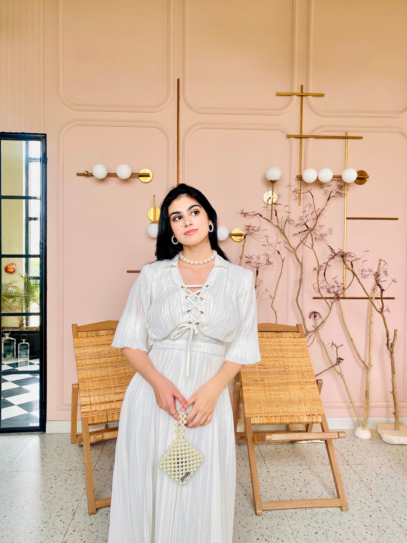 Criss Cross tie-up V neckline long dress with mariepuff sleeves made in pleated chiffon.