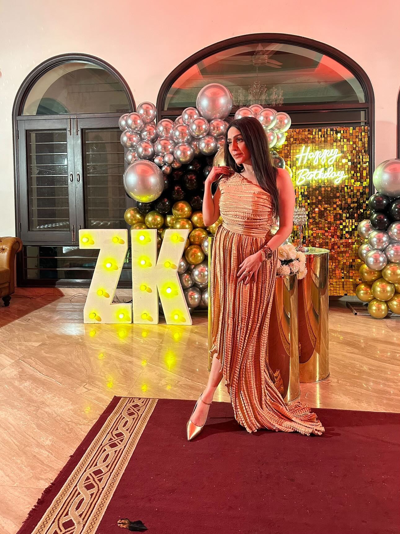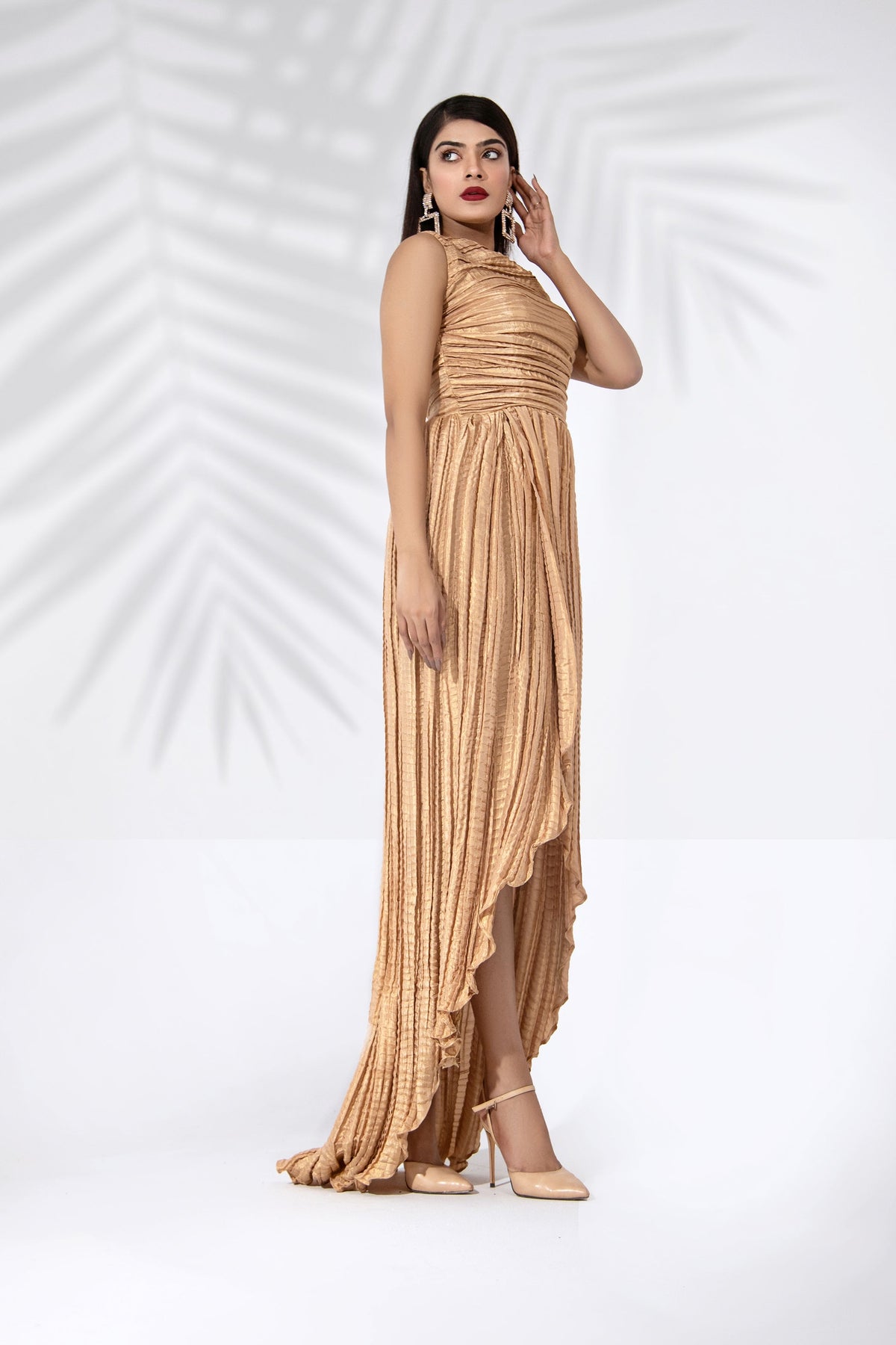 The dress is fashioned in classy crushed Masuri fabric, framed in a sleeveless bodice with an asymmetrical neckline. The skirt features a ravishing high-centred leg slit in front as it finishes with a flare at the back.