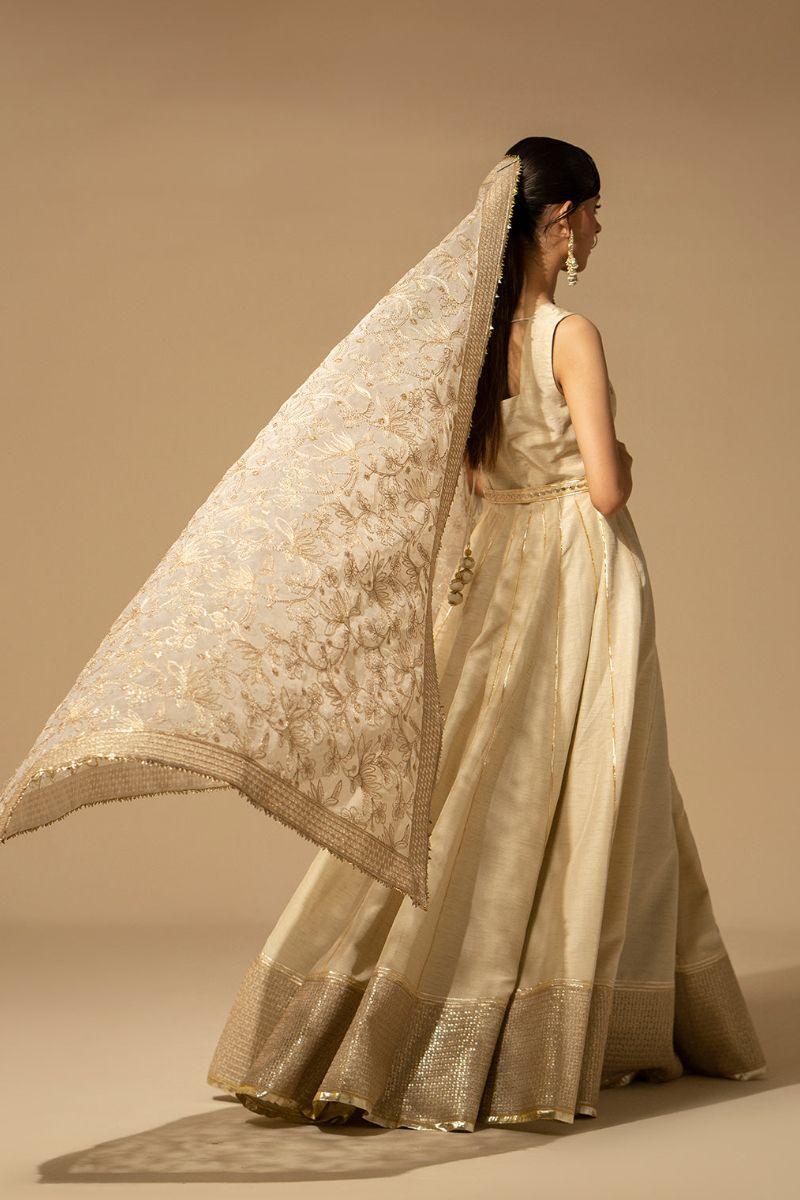 The luxurious  raw silk formal pishwas is a vision of opulence, featuring a full heavy sequins border adorning the bottom of the pishwas. Gotta work graces the pleated panels and bodice, while a belt made from Gotta work cinches the waist beautifully. The square front and back neckline adds a touch of modernity, while hand-made tassels on the back offer a subtle playfulness.