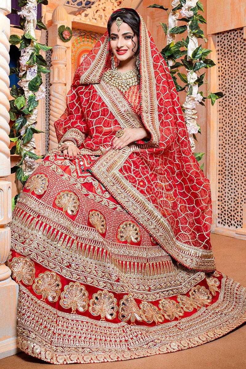 Smouldering red bridal lengha choli outfit, traditional lengha with a double flare lined with jamawar, rich Ari embroidery in rose gold tilla fully embroidered with adda work along with sitara chatta to add sparkle finished with katdana hanging tassels, Arched back cutline on choli with handmade jhumka tassels and gota kinari. Bridal duppta in embroidered orgenza with finished palu in fancy borders.