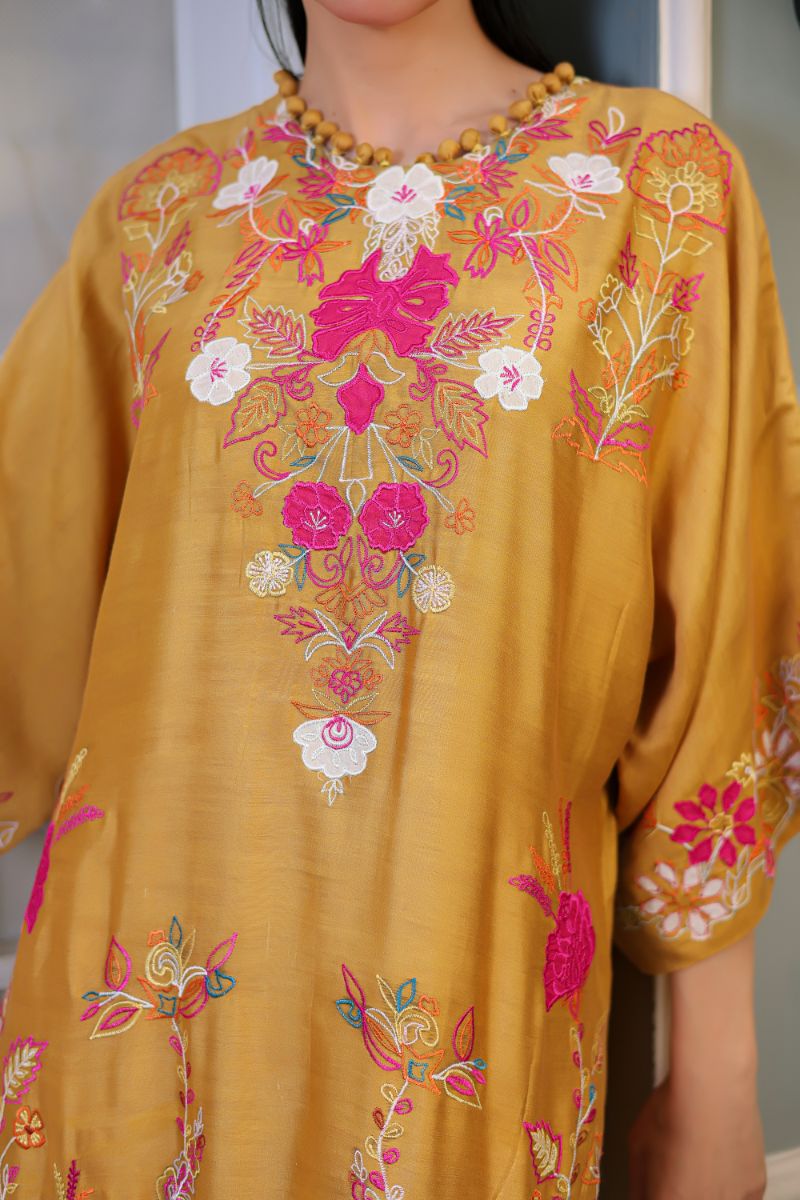 Exuding elegance and showcasing masterful artistry, this outfit embodies the essence of intricate embroidery patterns. With vibrant colors that come to life, it stands as a bold celebration of refined style.