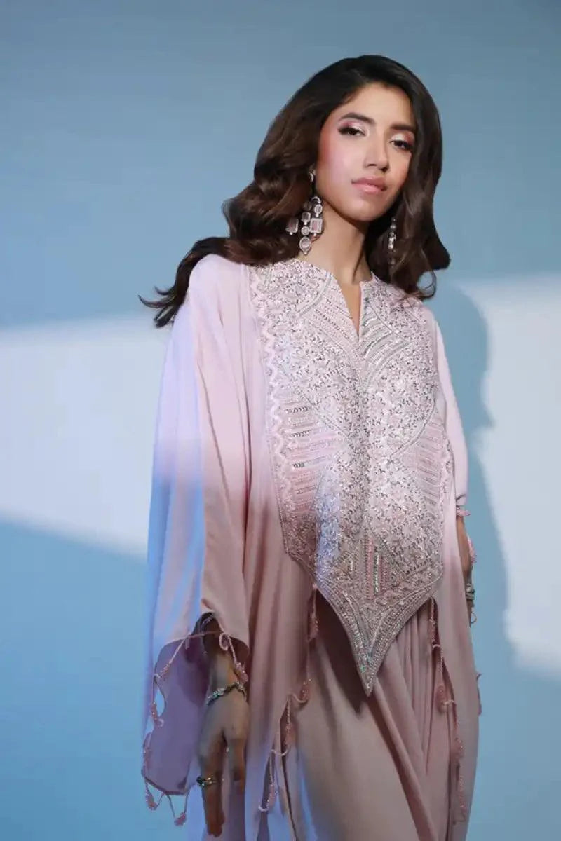 Luminescent wonders await. A pink georgette top and lowers with handwork in sequins, beads and crystals.
