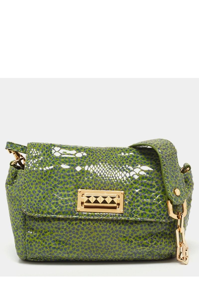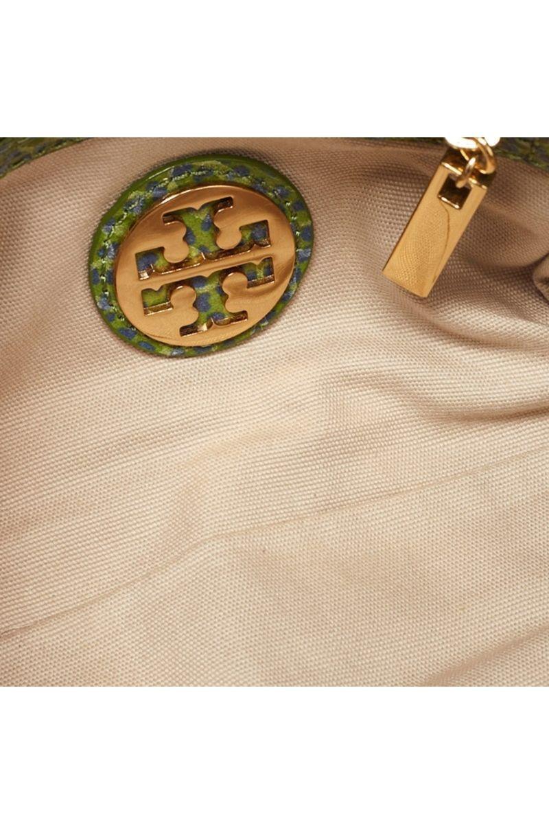 This shoulder bag from the House of Tory Burch offers eternal style, luxury, and functionality. It is crafted using green-blue python-printed leather on the exterior and exhibits a fabric-lined interior and gold-tone hardware. This bag is the perfect accessory to own. In good condition with minor scuffs/creases/marks on some areas & minor scratches on metal.