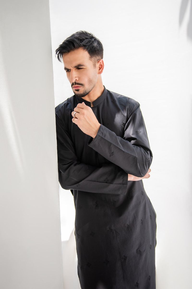 Description: A modern signature embroidered kurta with Mandarin collar; paired with straight trousers. This is a 2-piece stitched outfit.