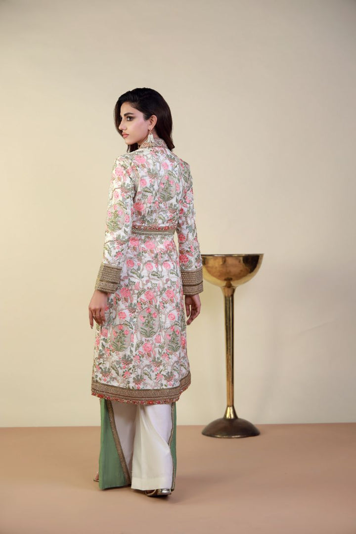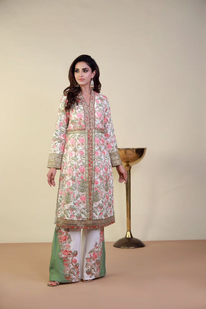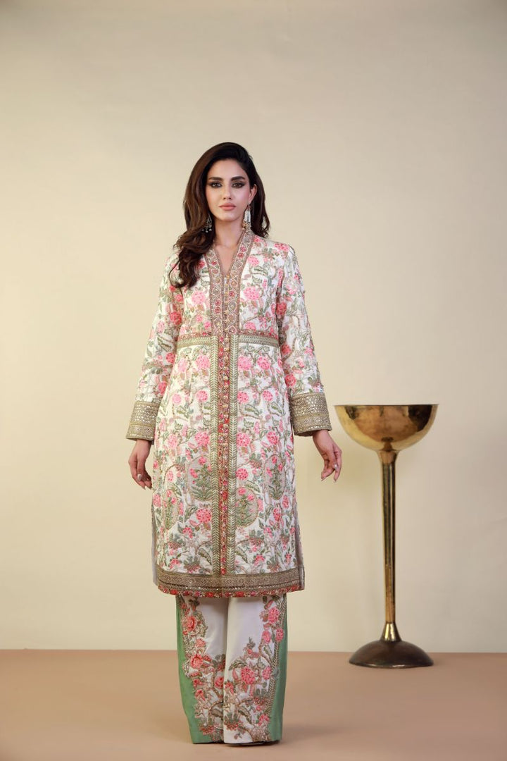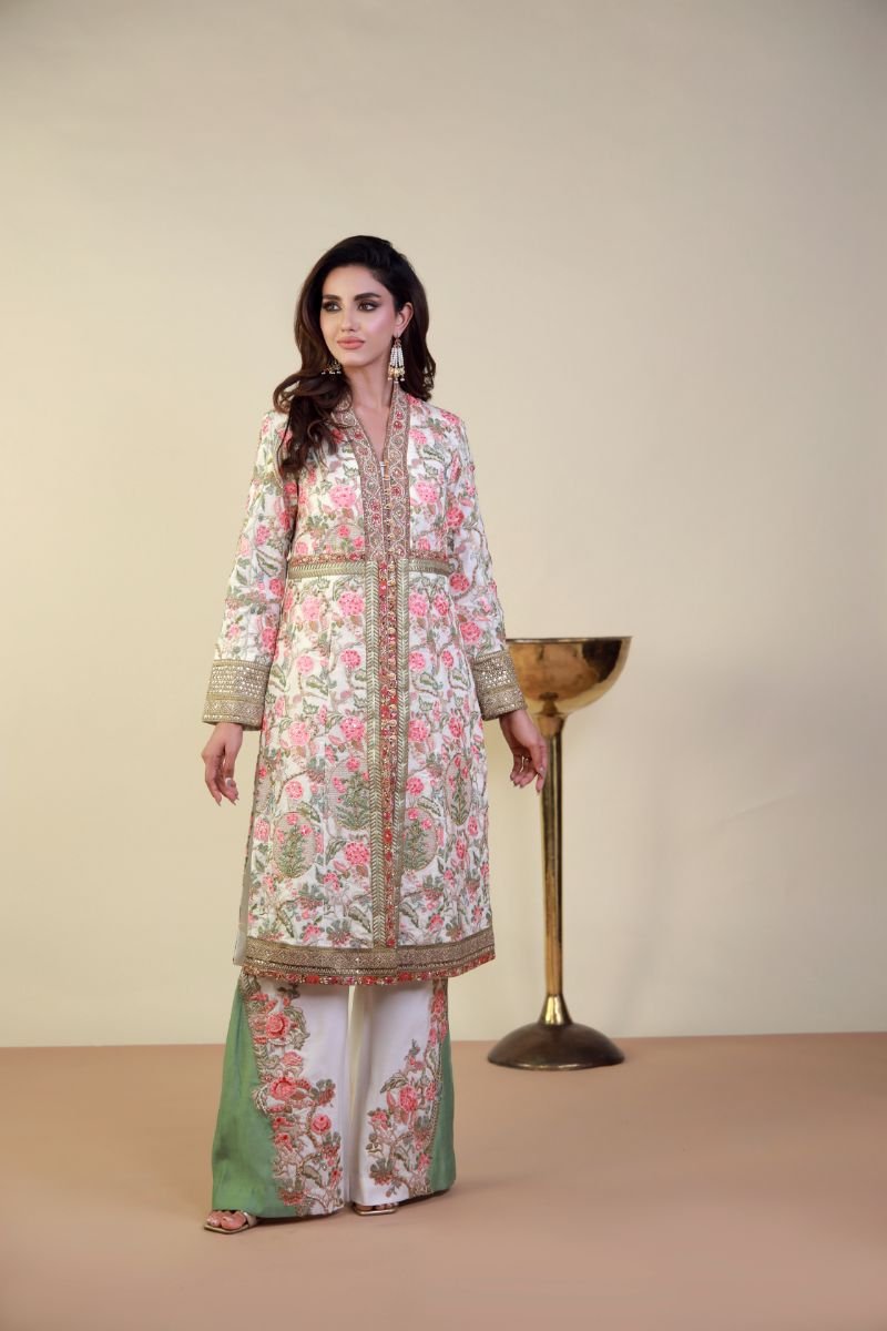 This elegant ensemble features a beautifully embroidered long coat-style tunic with intricate floral patterns in soft pink and green hues over a delicate white base. The rich embroidery is enhanced with gold and pearl detailing along the neckline, front panels, and cuffs, adding a regal touch. Embroidered wide-leg trousers in a complementary green shade, the outfit exudes sophistication and grace. The sheer dupatta with ornate borders further elevates the look, making it perfect for festive occasions, weddings, or formal gatherings. The pastel color palette and exquisite craftsmanship ensure a refined and timeless appeal.