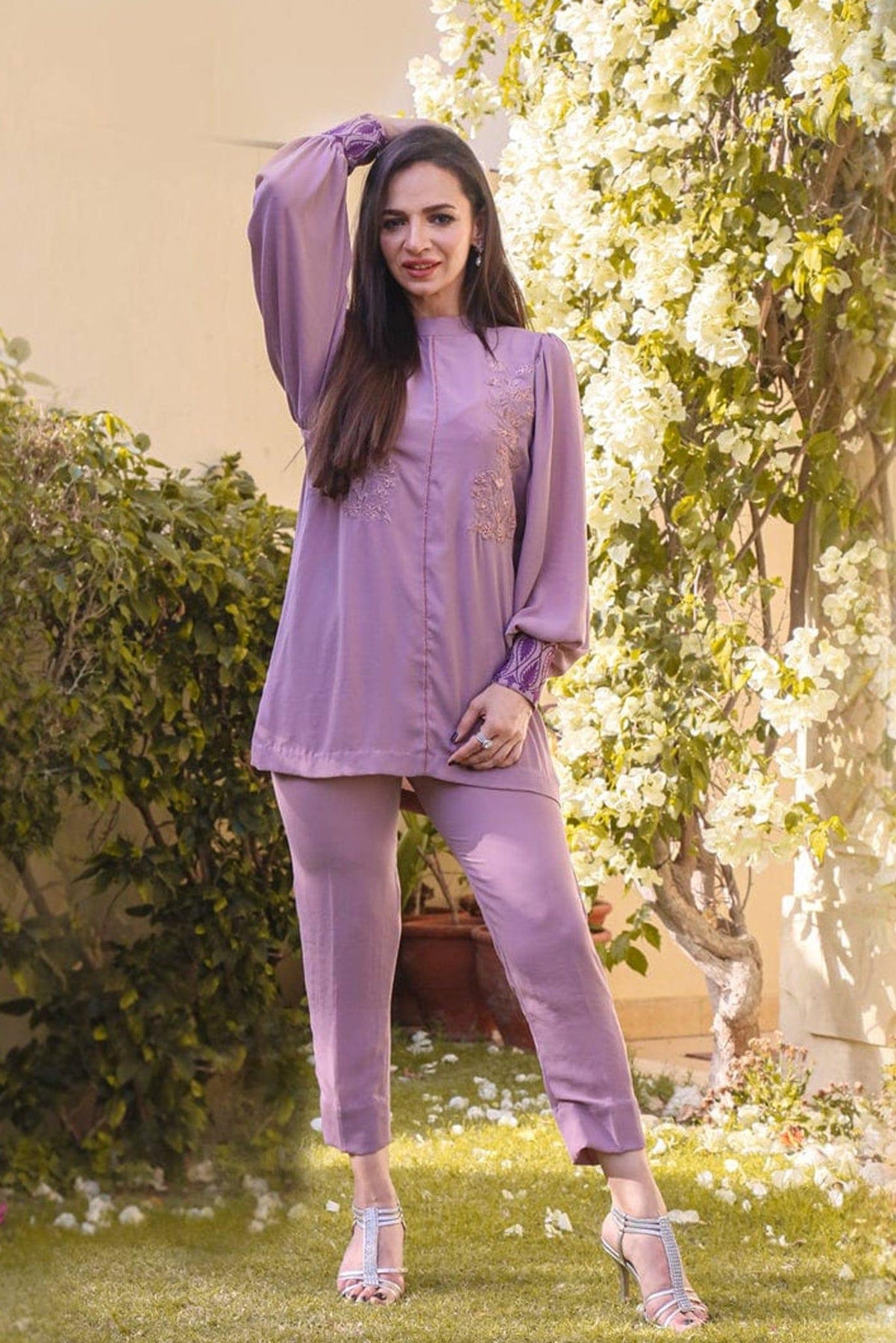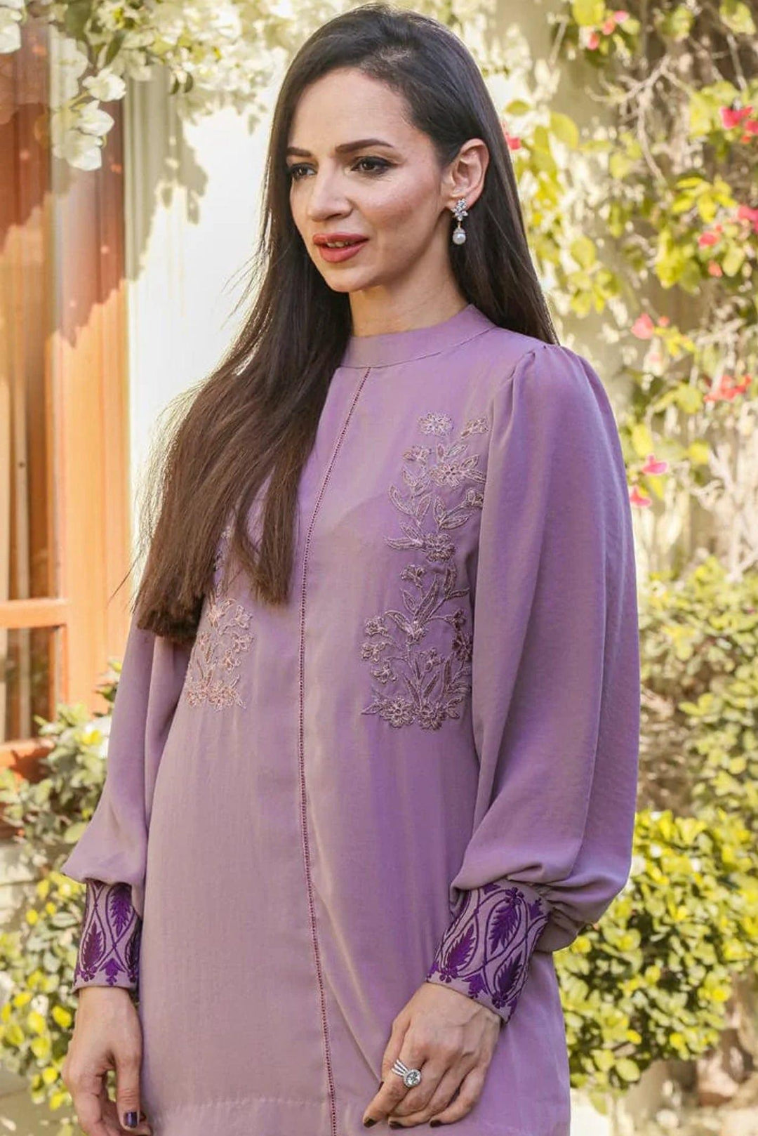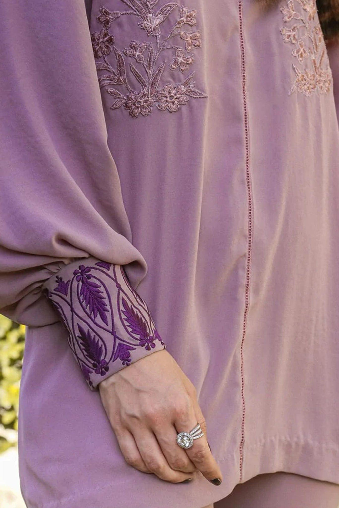 MYNA Top: Mauve top with thin pleated baggy sleeves along with embroidery over cuffs and front