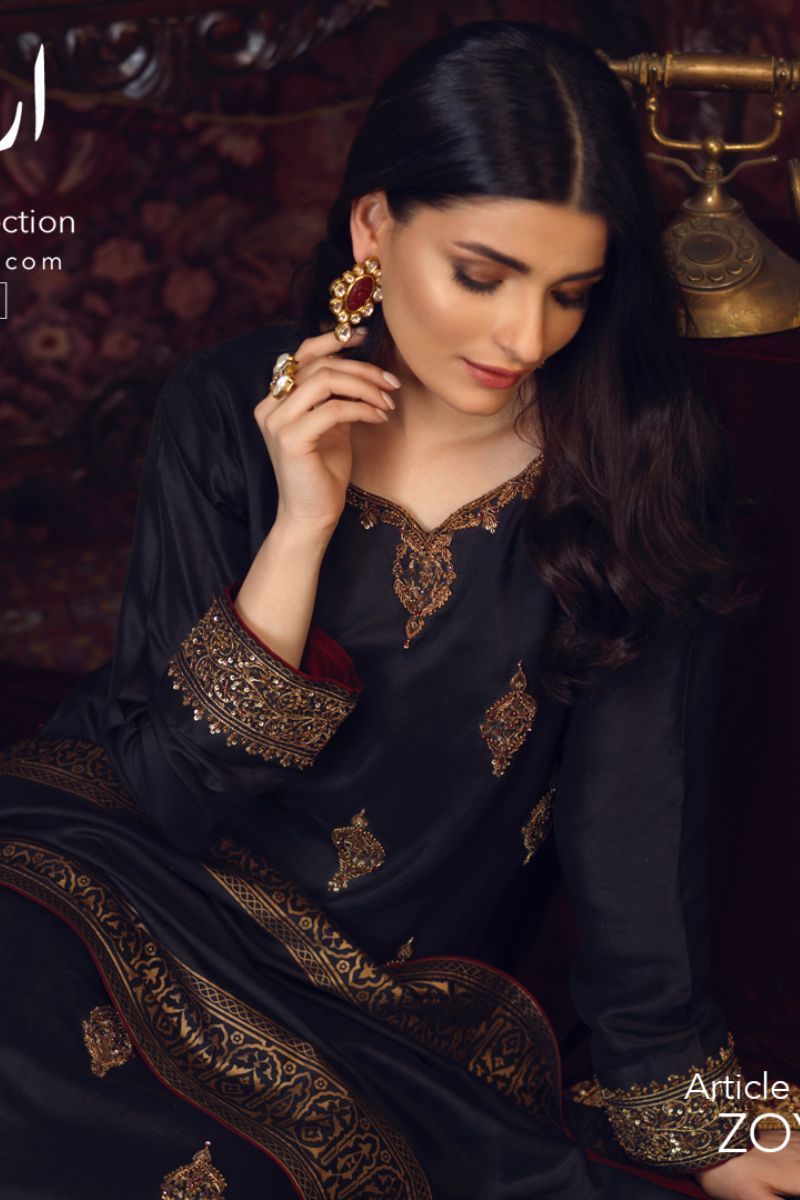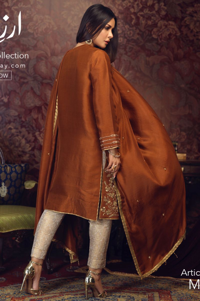 'Rang Rasiya' is a Ready Made Online Luxury Formal Women Three Piece Dress purple raw silk long angrakha with detailed hand embroidery, rendered in glowing tilla, gotta, dabka and resham work. It is finished with navy blue screen printed border. The dress is paired with net dupatta with golden scallops and fancy finishing on the pallu.