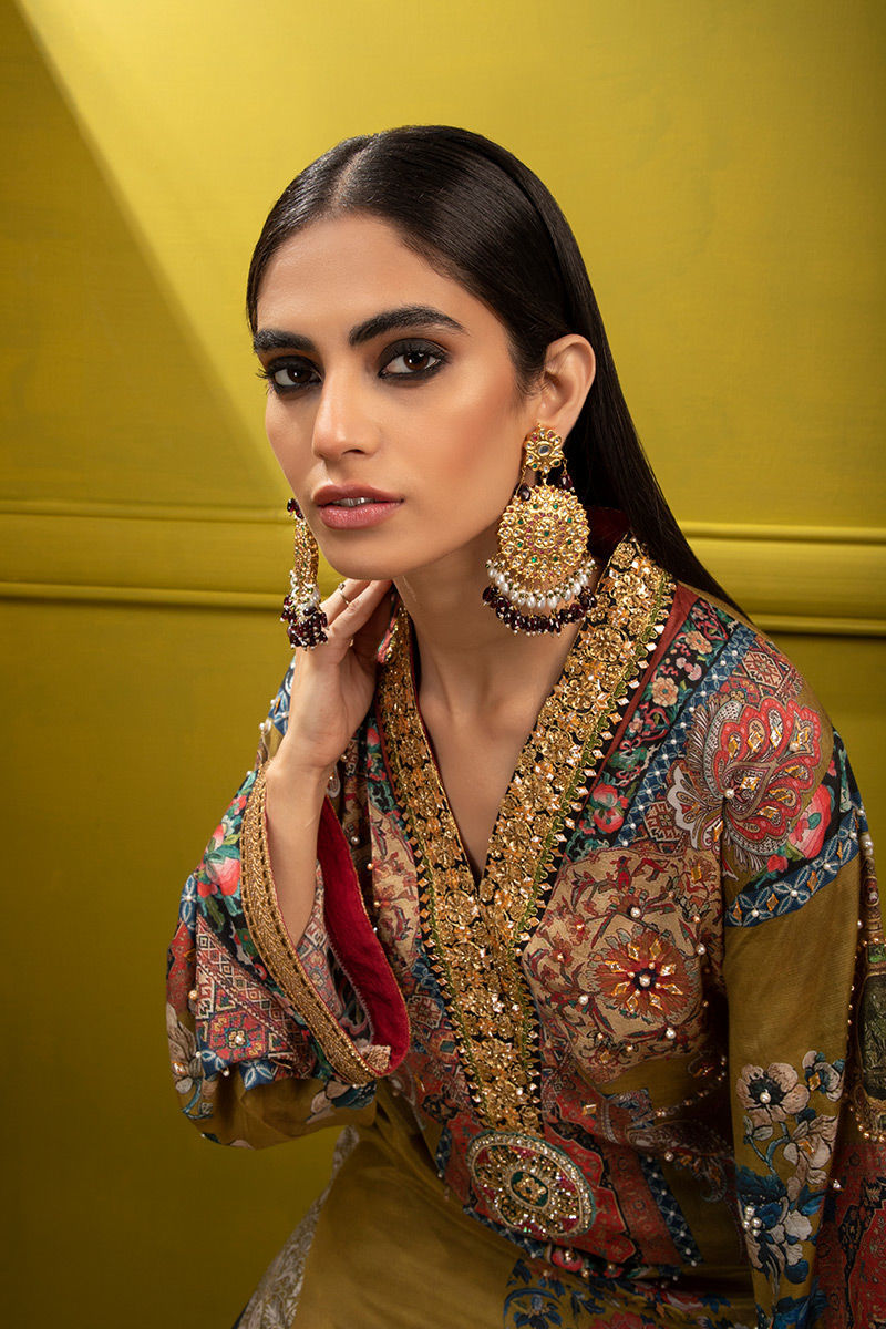 Free style traditional kurta intricate ethnic print printed on dull green canvas print on silk fabric and enhanced with gota and pearl work intricate galla patti and motif constructed with handcrafted zardozi work finished with beautiful handcrafted lace made with antique gold tila thread and sequene work.