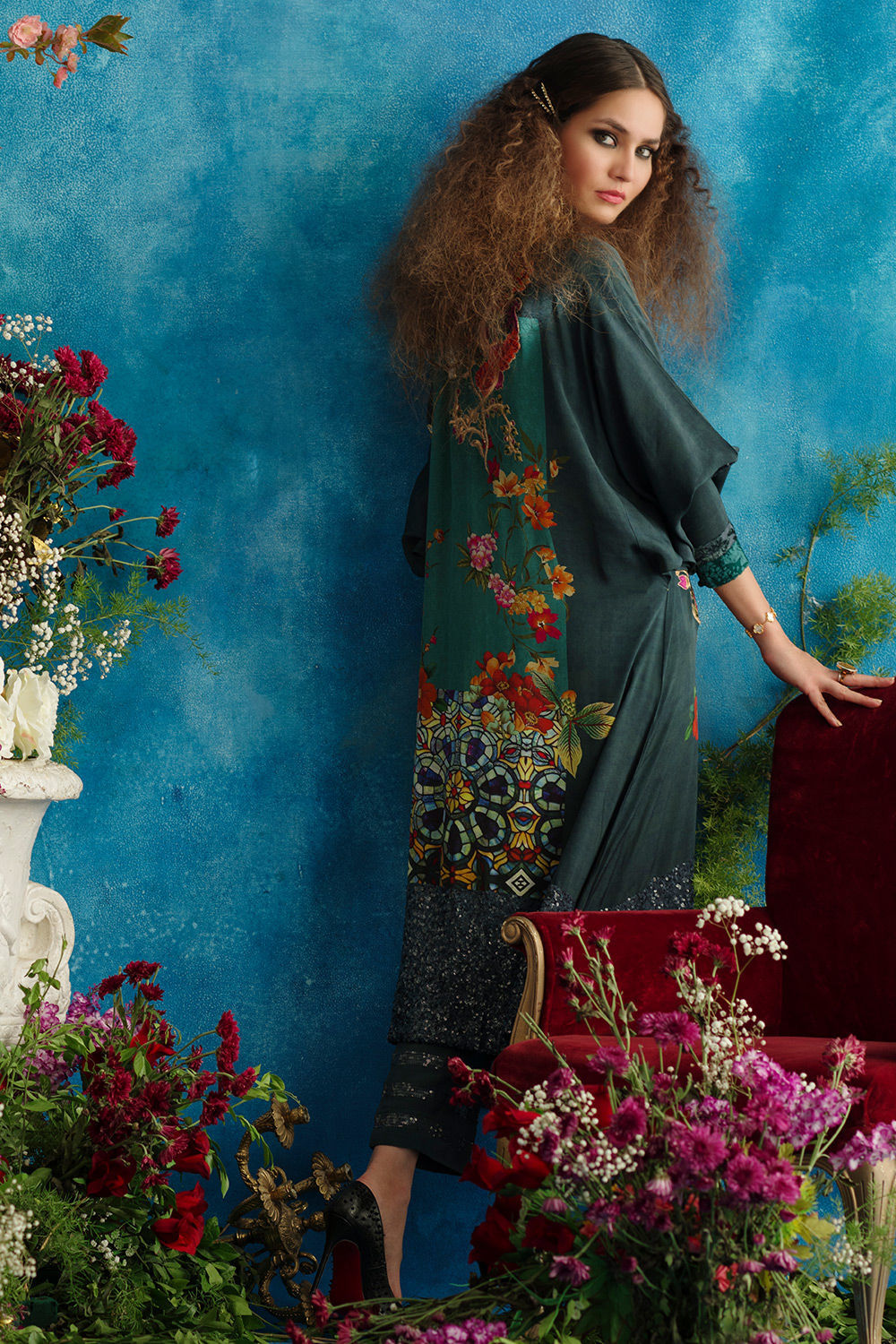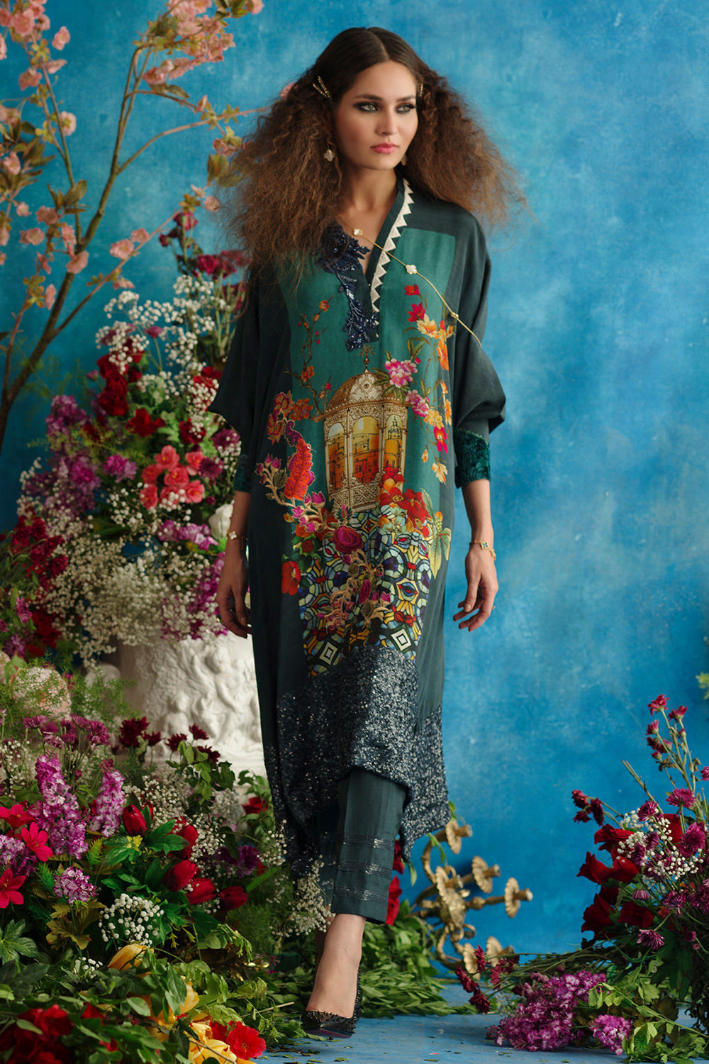 Silk tunic digitally printed back and front, hand work resham worked with sequins hand work write side of galla, thread work asymmetrically positioned on left side in ivory with geometric worked pattern. Thread hand worked stem in multicoloured placed on write side of the main front sequins border in deep blue at hem base tunic.